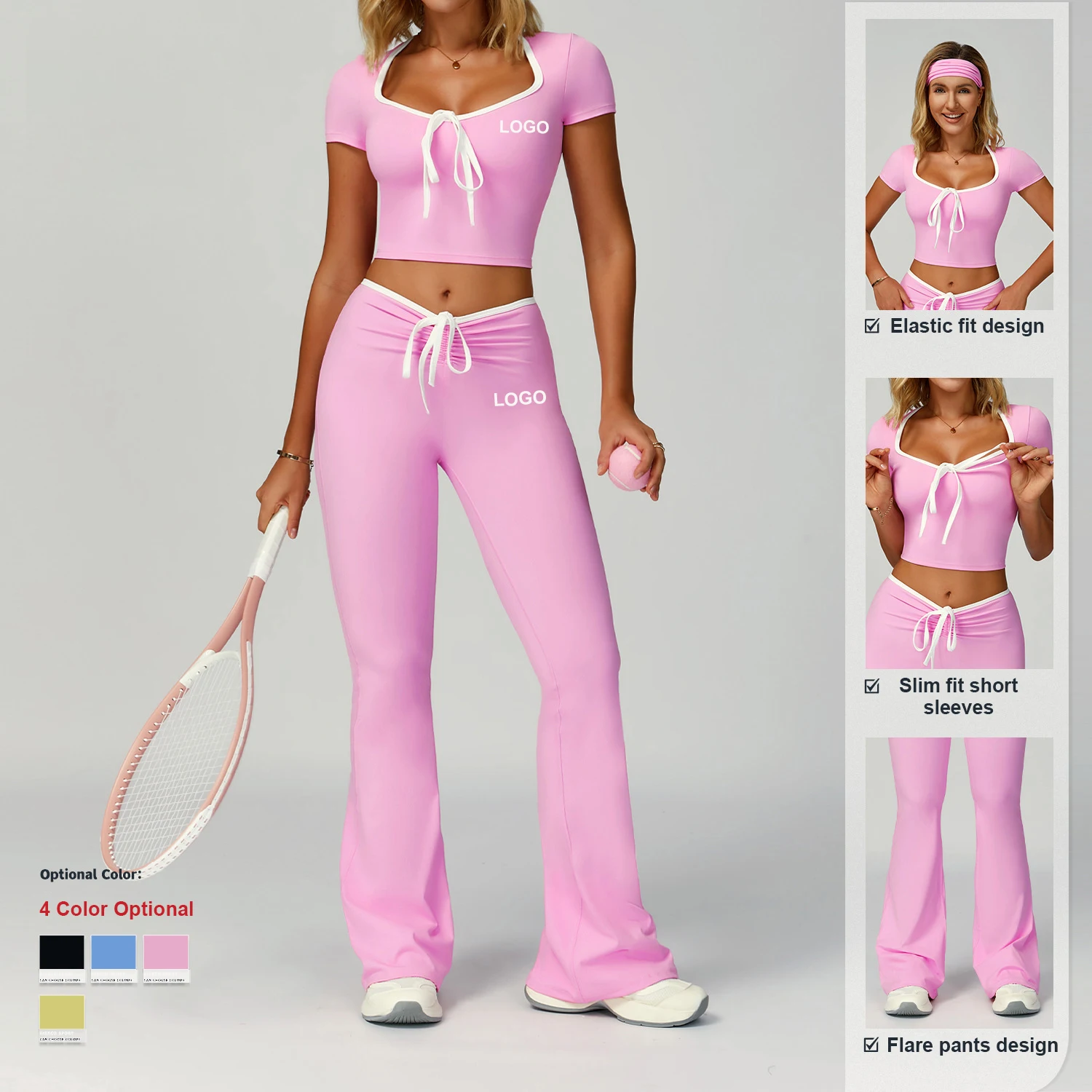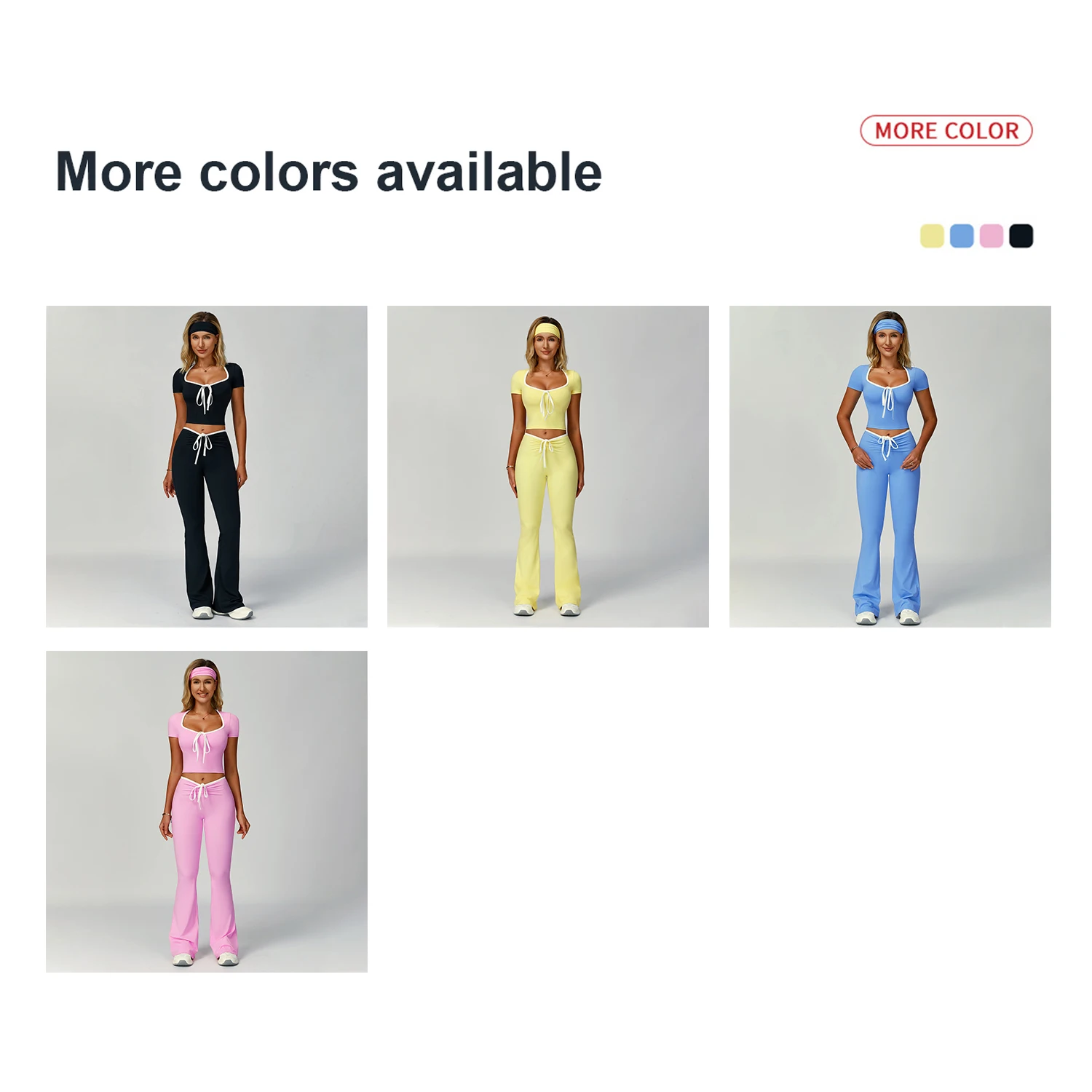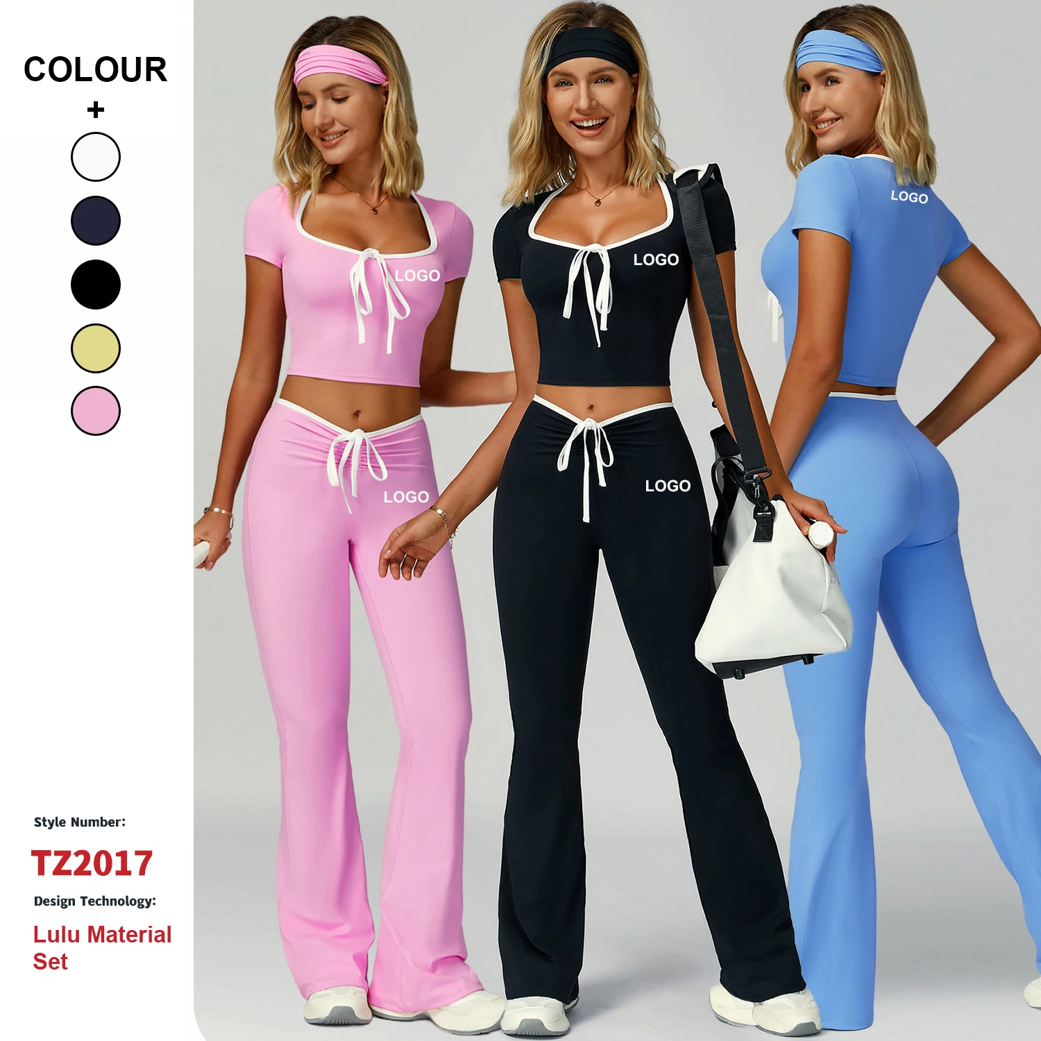 Contrast Color Fitness Clothes Women High Waisted Flared Pants Suit Casual Outdoor Short-Sleeve 2-Piece Sports Fitness Yoga Set