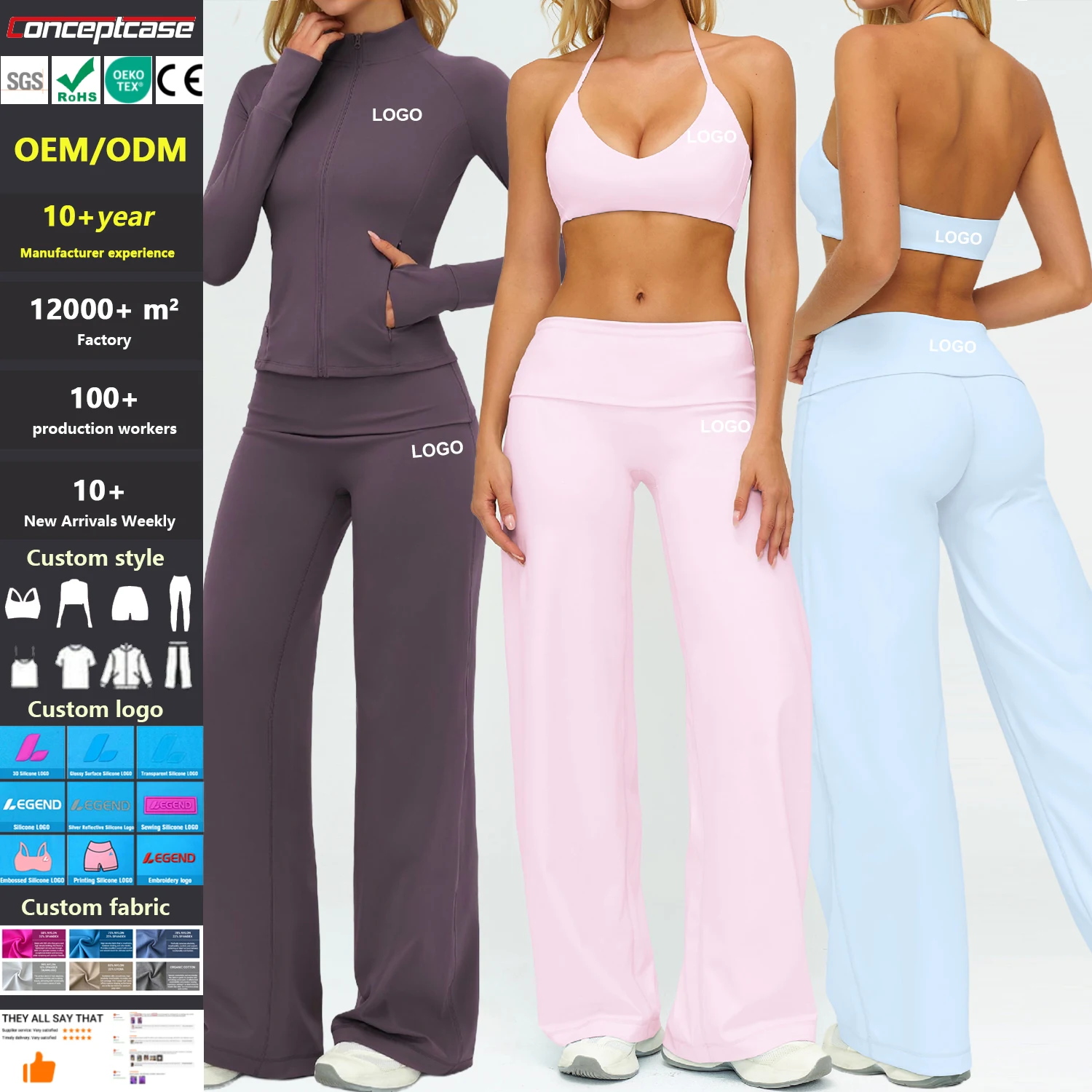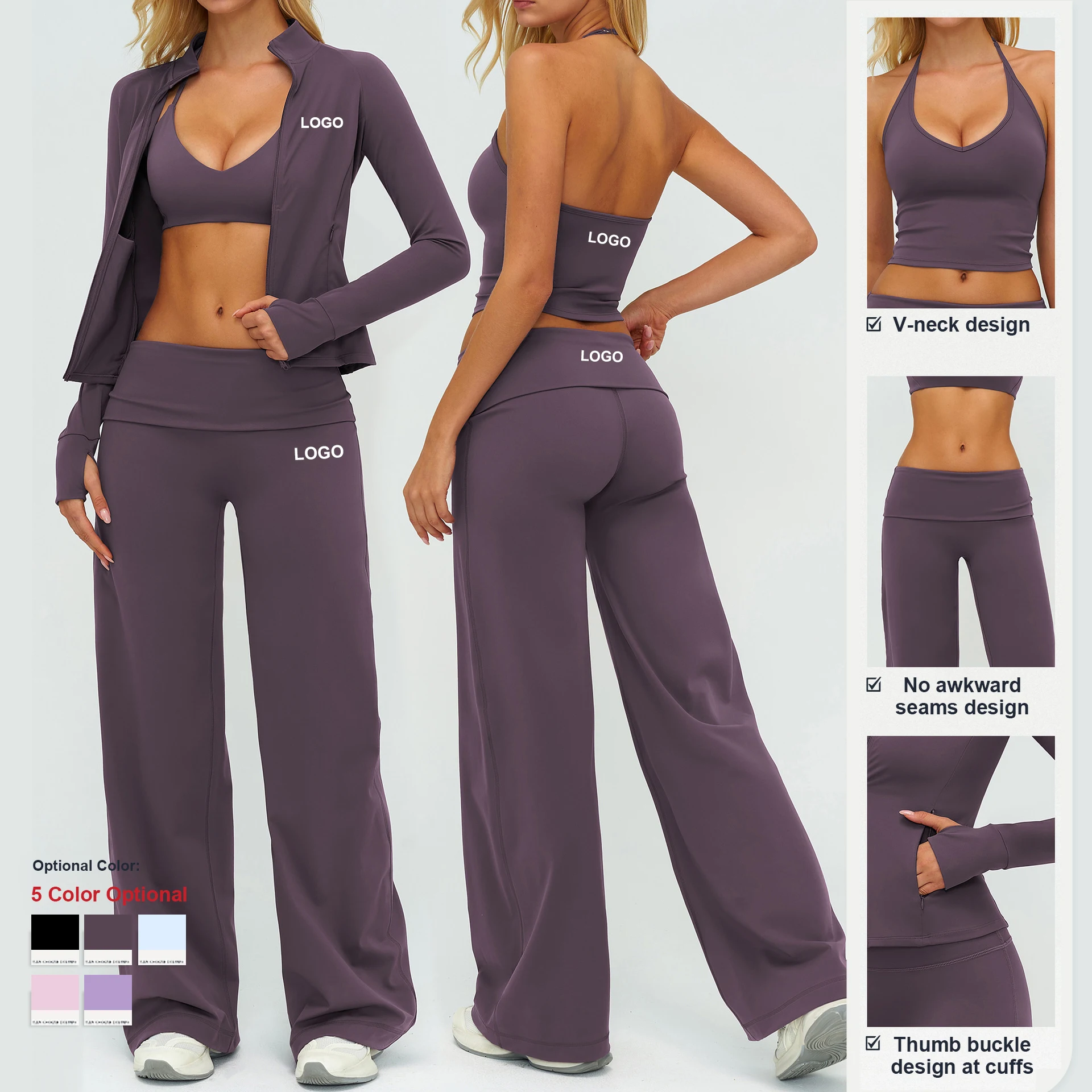 Custom Fabric Style Color Logo Quick Dry Flare Pants Sports Clothes Suit Women Outdoor Long Sleeved Jacket Three-Piece Yoga Set