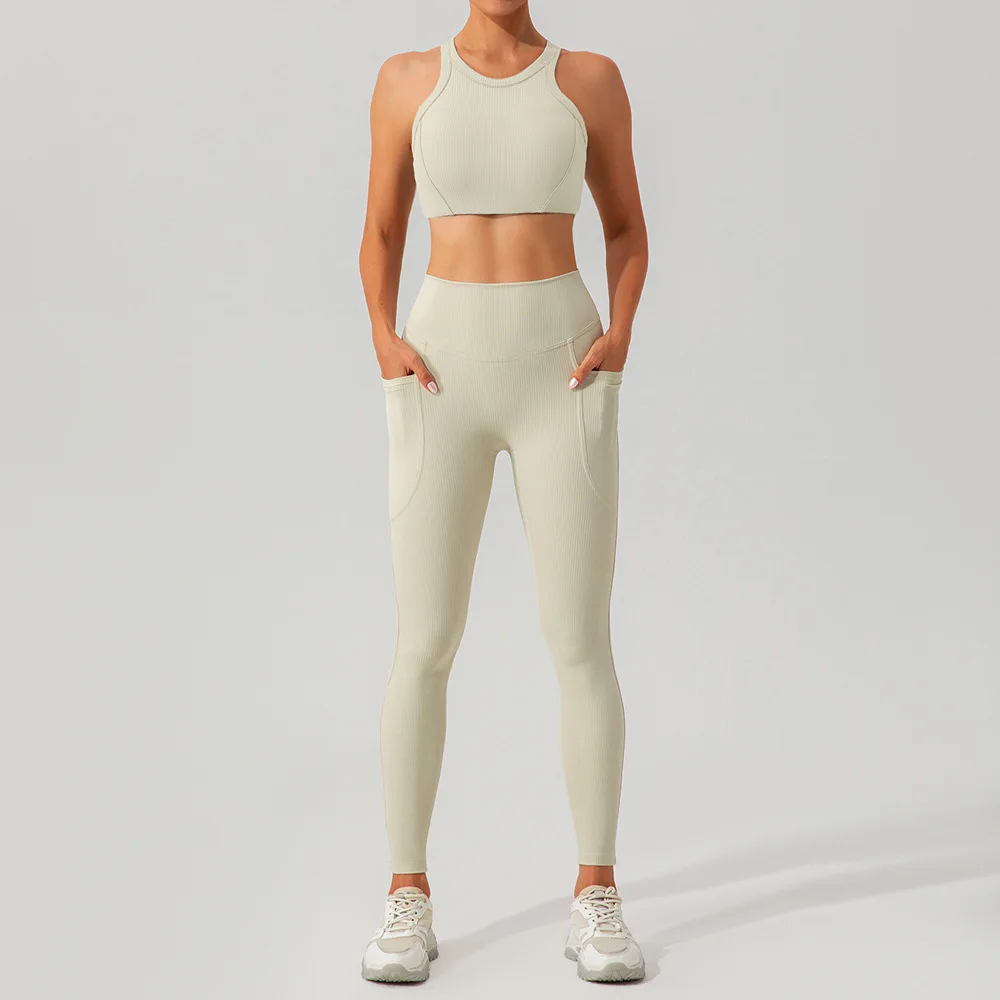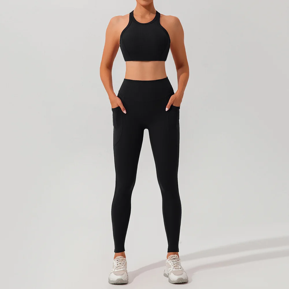 Women Custom Logo Yoga Set Breathable Quick Dry Fitness Sport Suit With Elastic Waist Leggings Bra Solid Pattern Workout Wear