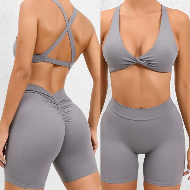 Backless Twist Sport Bra for Women Deep V Shape Back Scrunch Butt Tight Booty Lifting Ribbed Yoga Pants Leggings Shorts Yoga Set