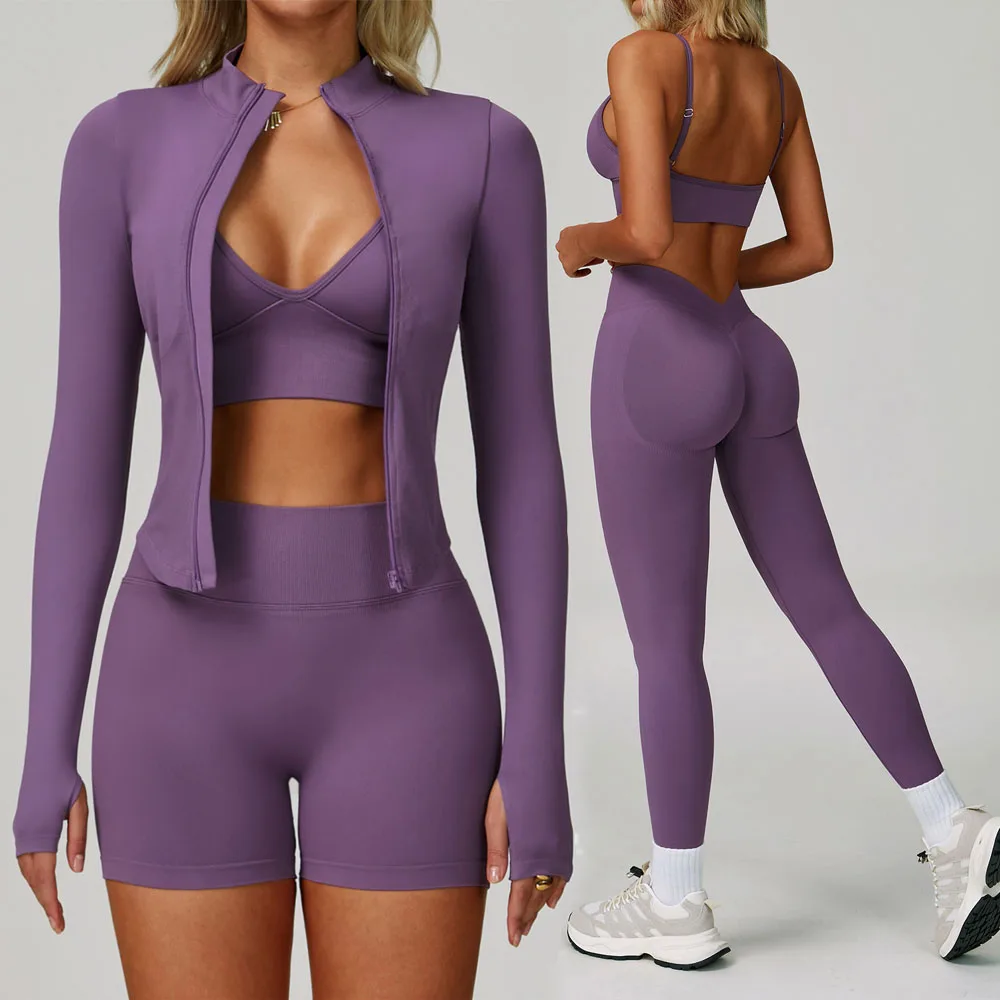 Custom Logo Seamless GYM Yoga Fitness Sport Wear Long Sleeve Zipper Jacket Butt Lift Deep V Women Yoga Leggings Pants Yoga Sets