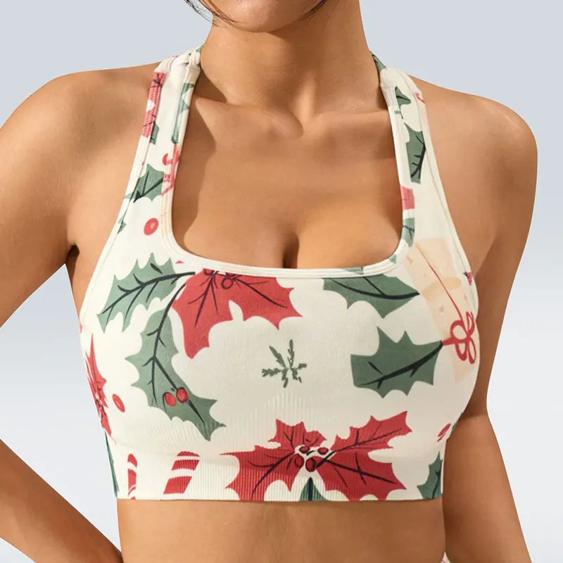 Yoga Sports Bra Seamless Breathable Square Neck Maple Leaf Printed High Support Top for Woman Out Wear