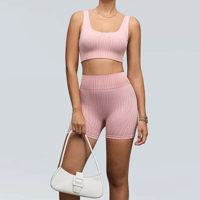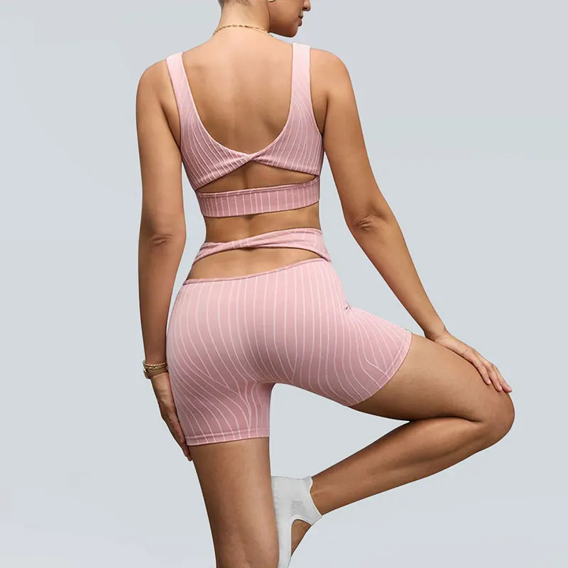 Customized Seamless Woman's Yoga Sets Two Pieces Twist Design Breathable Bra and High Waist Elastic Shorts for Sports Outwear
