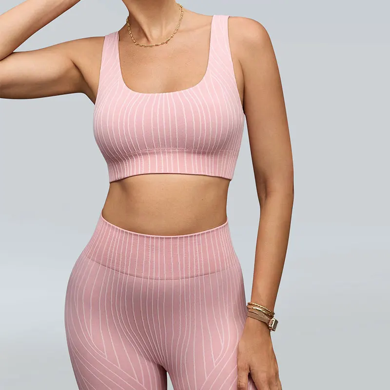 Customized Seamless Women's Yoga Sets: Pink Striped Twist Design Beautiful Back Bra and Butt Lift Elastic Pants for Sports Wear