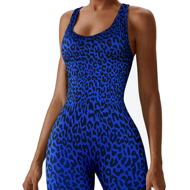 Deep Blue Leopard Print One Piece Flared Pants Bodysuit With Removable Padded Cups Backless Slim Fit Yoga Activewear for Women