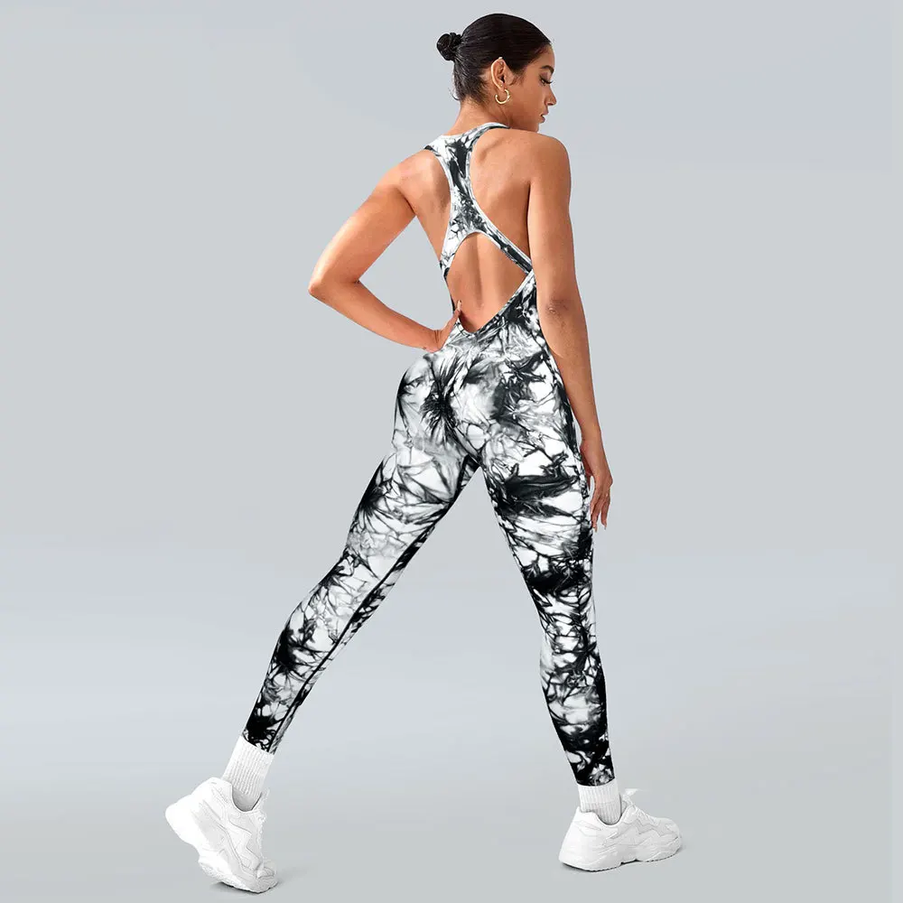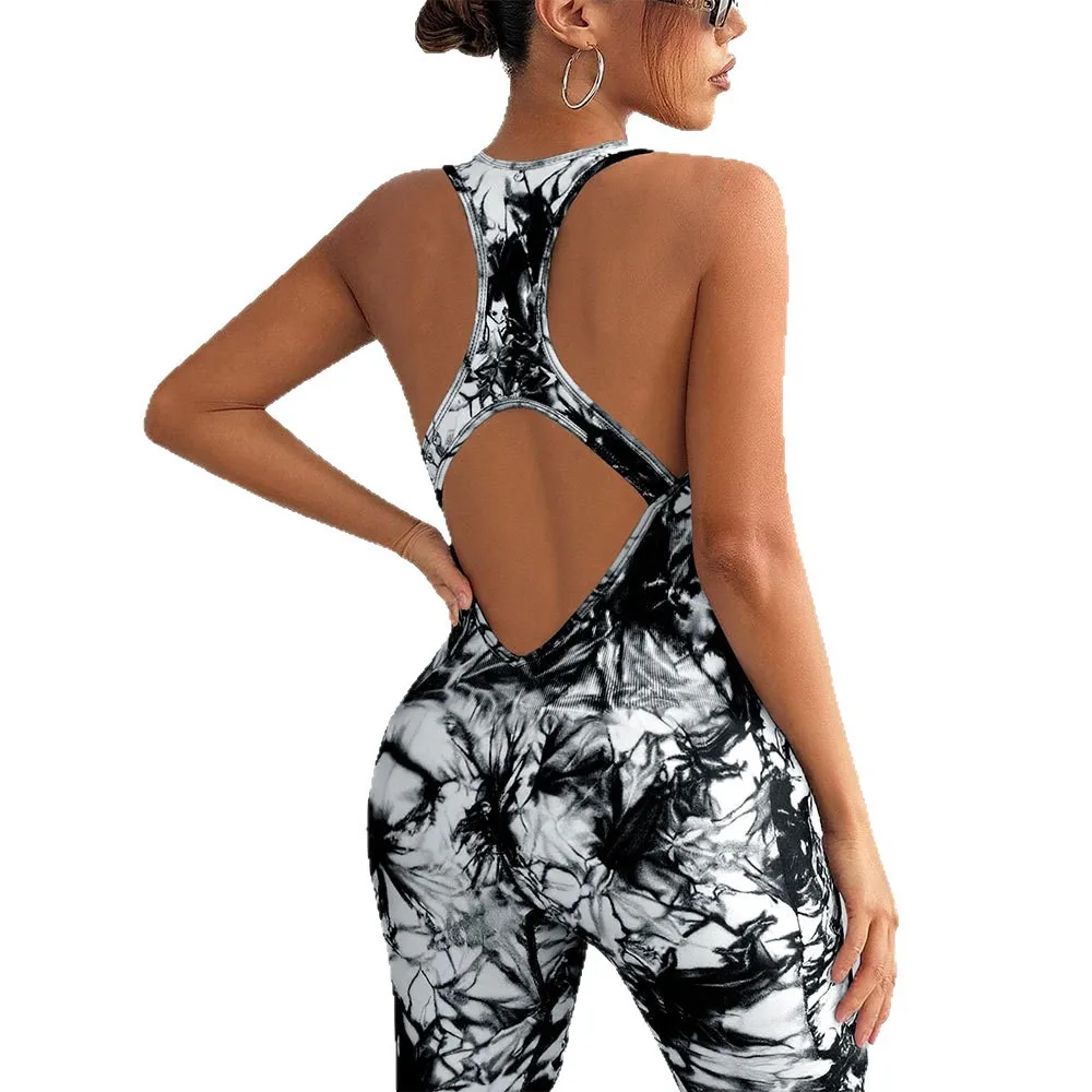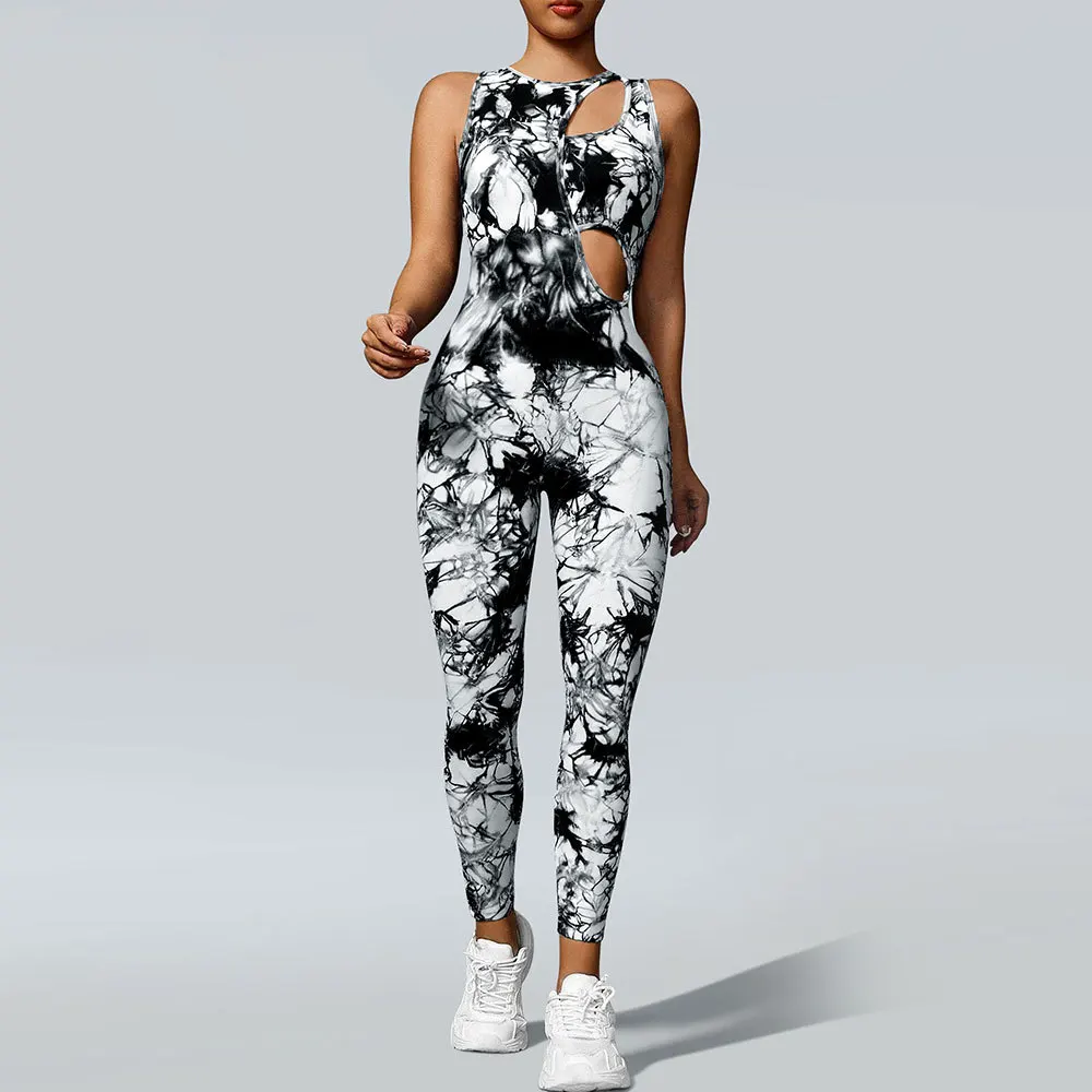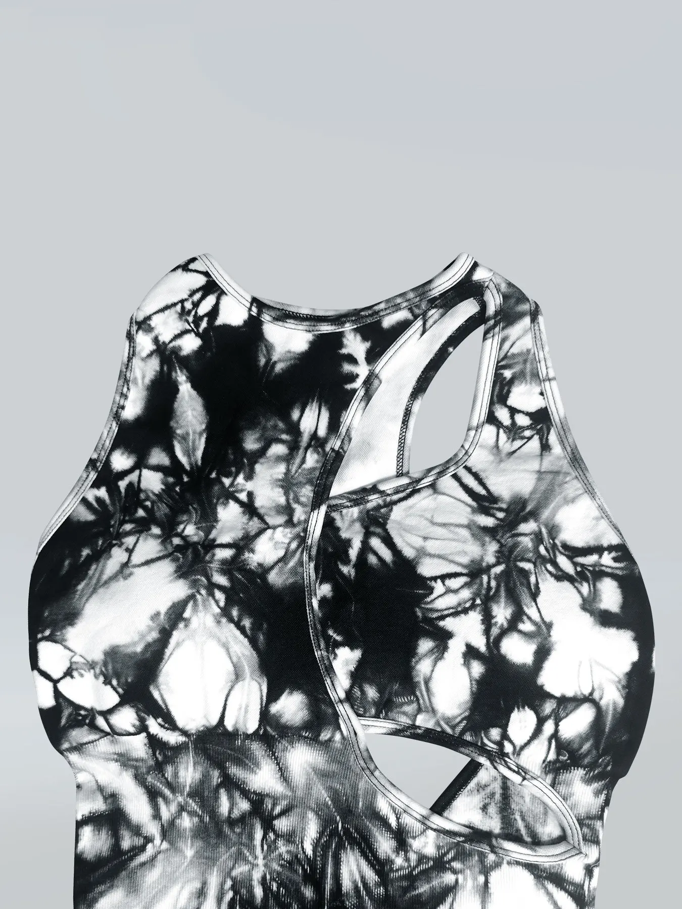 Women's Breathable Yoga Bodysuit Removable Hollow Out Black and White Tie Dye with Chest Pad for Sports