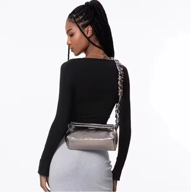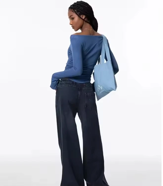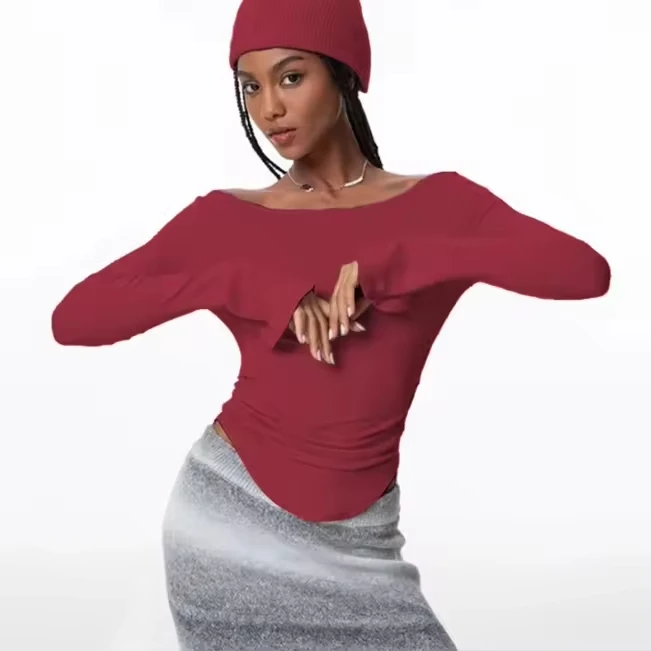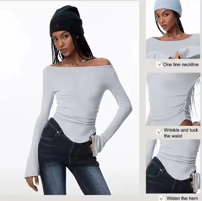 Slash Long Sleeves Flare Slim Fit Pullover Top Sexy Solid One Shoulder Tight Ruched Crop T-Shirt Breathable Front Logo