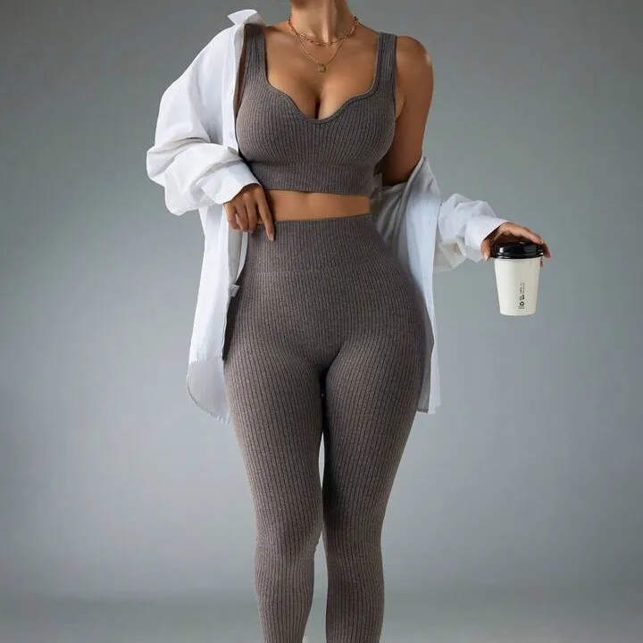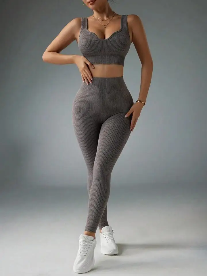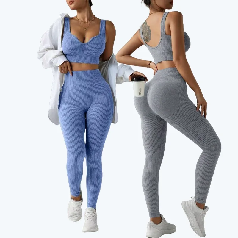 Hot Sale Women's Gym Training Yoga Bra Leggings Fitness Activewear Solid Color Ribbed Peach Hip Yoga Set Breathable Lightweight