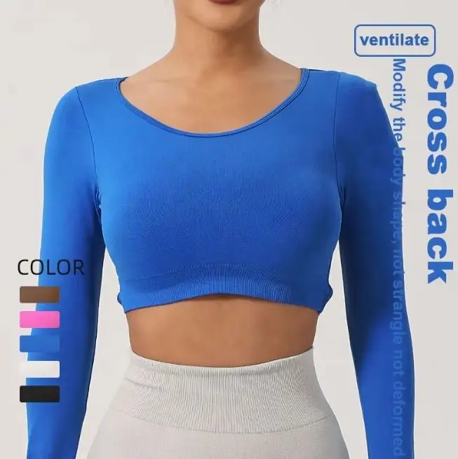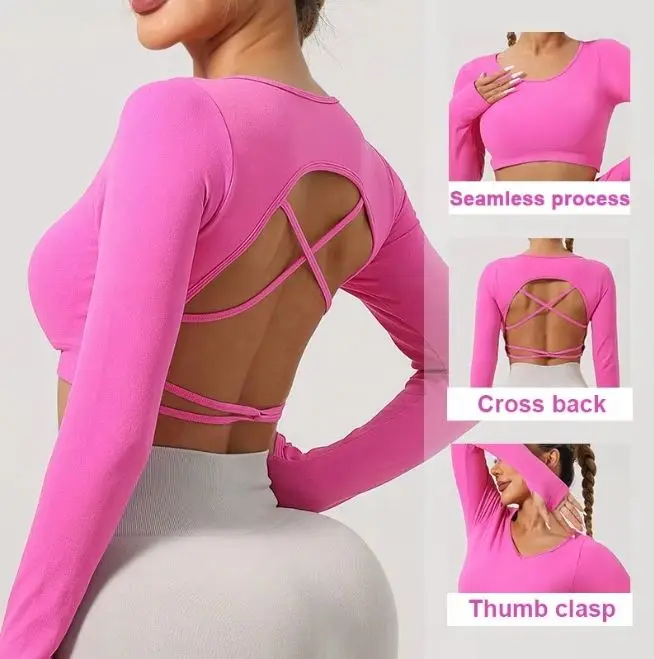 Customized High Quality Long Sleeve Breathable Fitness Hollow Back Knitted Women Yoga Quick Dry Sweat-Wicking Front Logo Tops