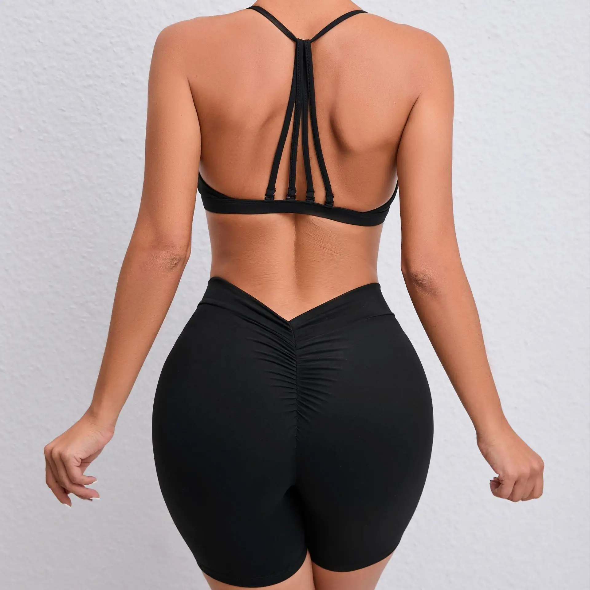 V-Back Scrunch Butt High Waist Biker Shorts Gym Yoga Sets Women's Breathable 2-Piece Workout Set Short Leggings Strappy Print