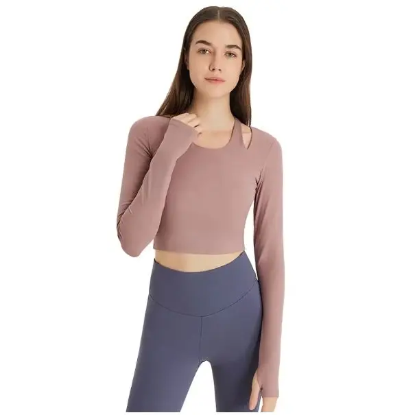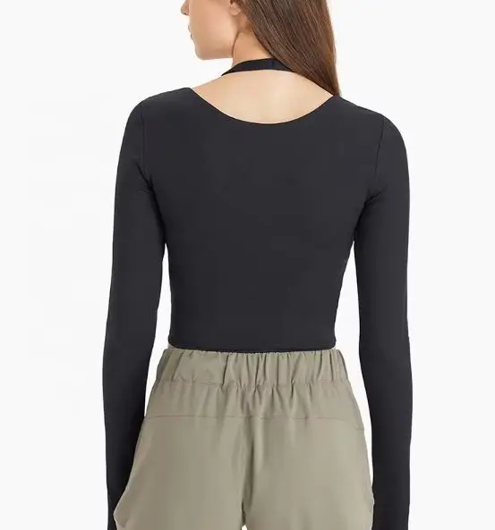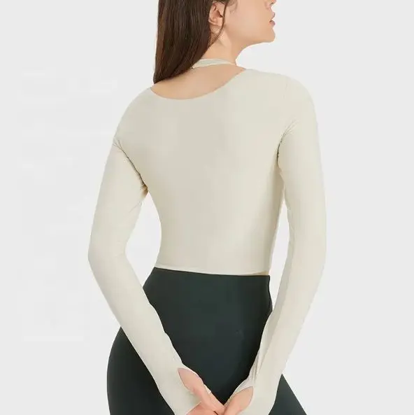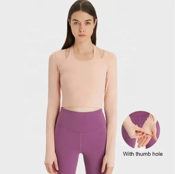 Comfortable Sexy Slim Fit Thumb Hole Halter Yoga Crop Top for Women Quick Dry Long Sleeve Yoga T-Shirts With Removable Pads