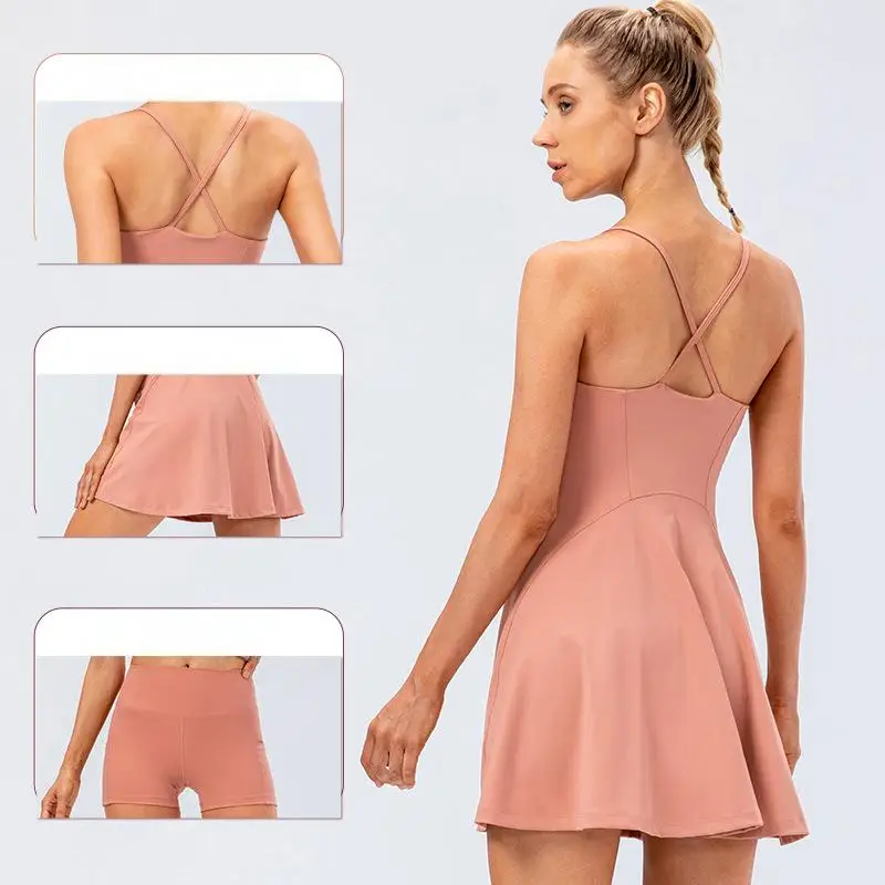 Nude Feeling Solid Anti-glare Sports Fitness Gym Tennis Dress & Shorts Set Golf Sport Elastic Waist Shorts with Pocket for Women