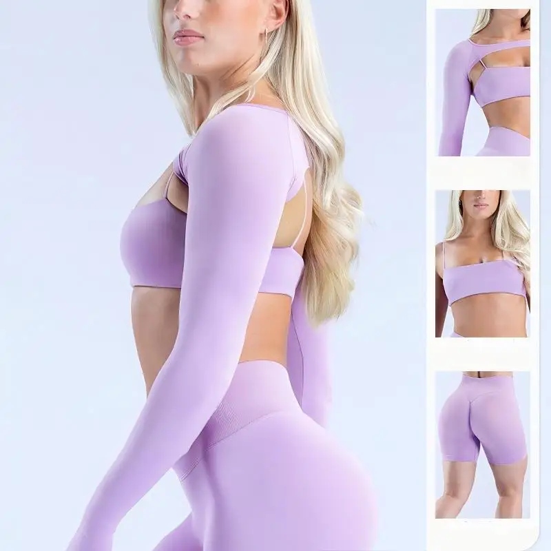 Popular Solid Color 4-Piece Gym Sports Fitness Yoga Set Quick Dry Sexy Bra & Long-sleeved Top & Shorts & Slim Pants for Women