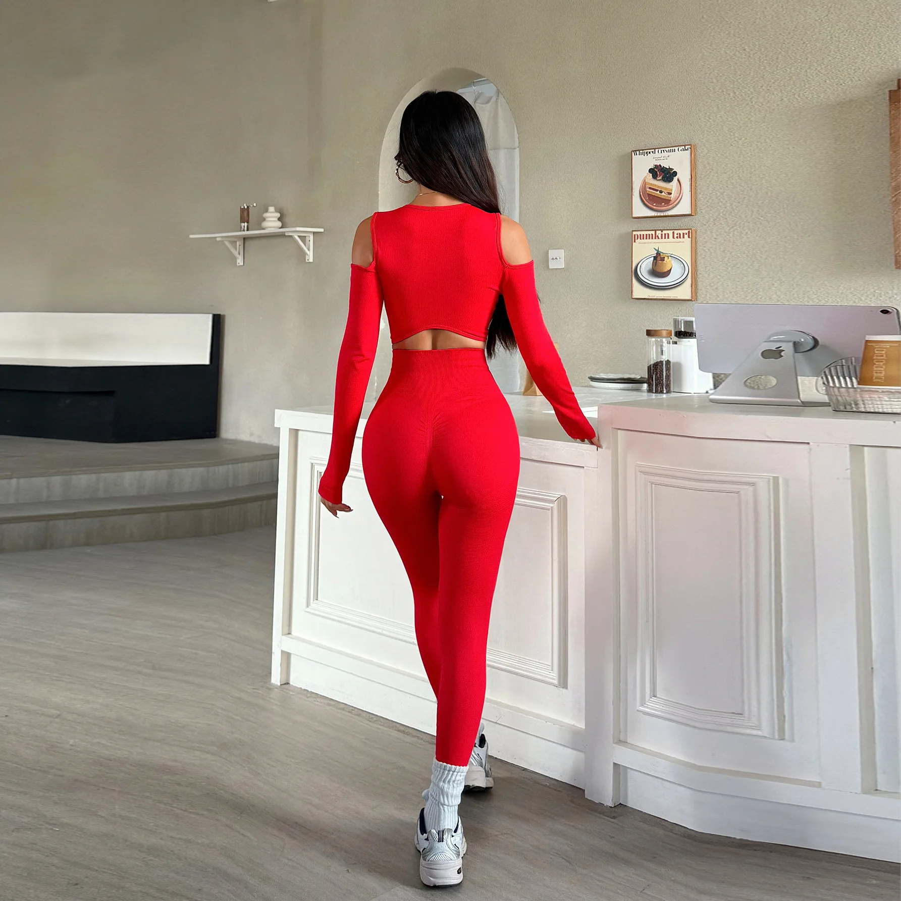 High Quality Nylon 2-piece Long-sleeved Yoga Set Off-the-shoulder Top & Butt Lifting Pants Leggings Gym Fitness Yoga Set Women