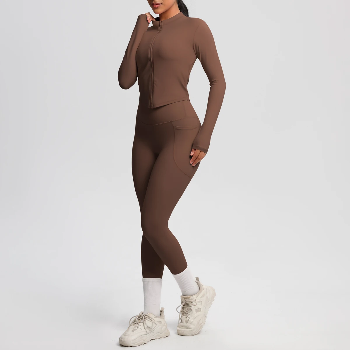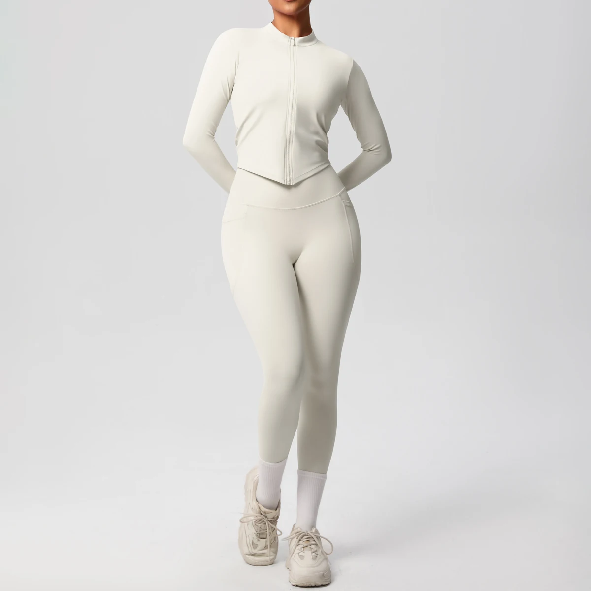 Wholesale Quick Dry Long Sleeve Top with Zipper Active Wear Gym Leggings with Pockets Yoga Set for Women