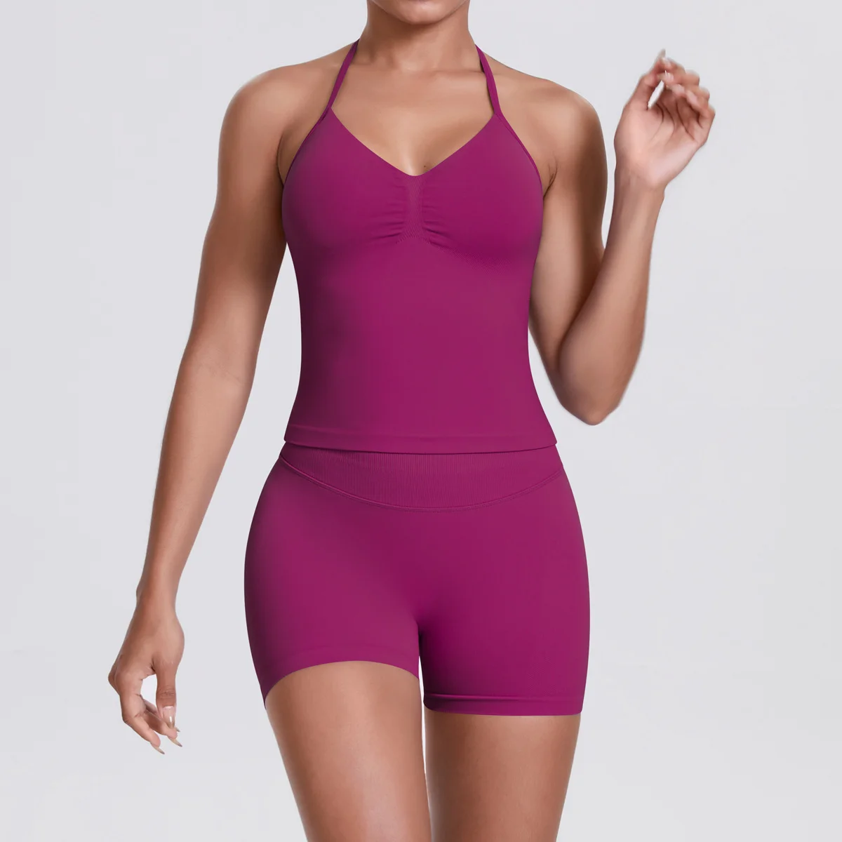 High Quality Two-Piece Sports Bra and High Waisted Shorts Set Solid Color Yoga Tank Top and Fitness Kit Front Logo Breathable