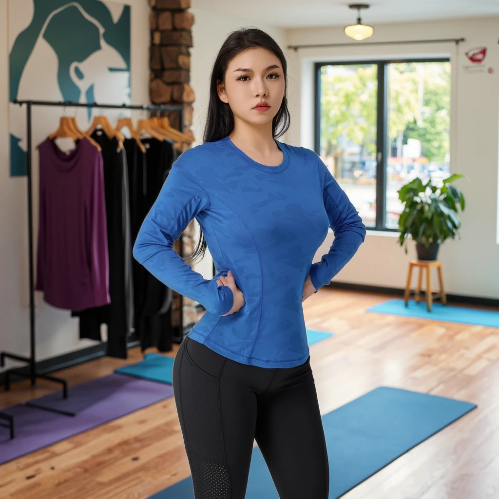 Breathable Comfortable and Stylish Yoga Wear Top Blue Comforteble Long-sleeved Yoga Top with Printed Craftsmanship Women Gym