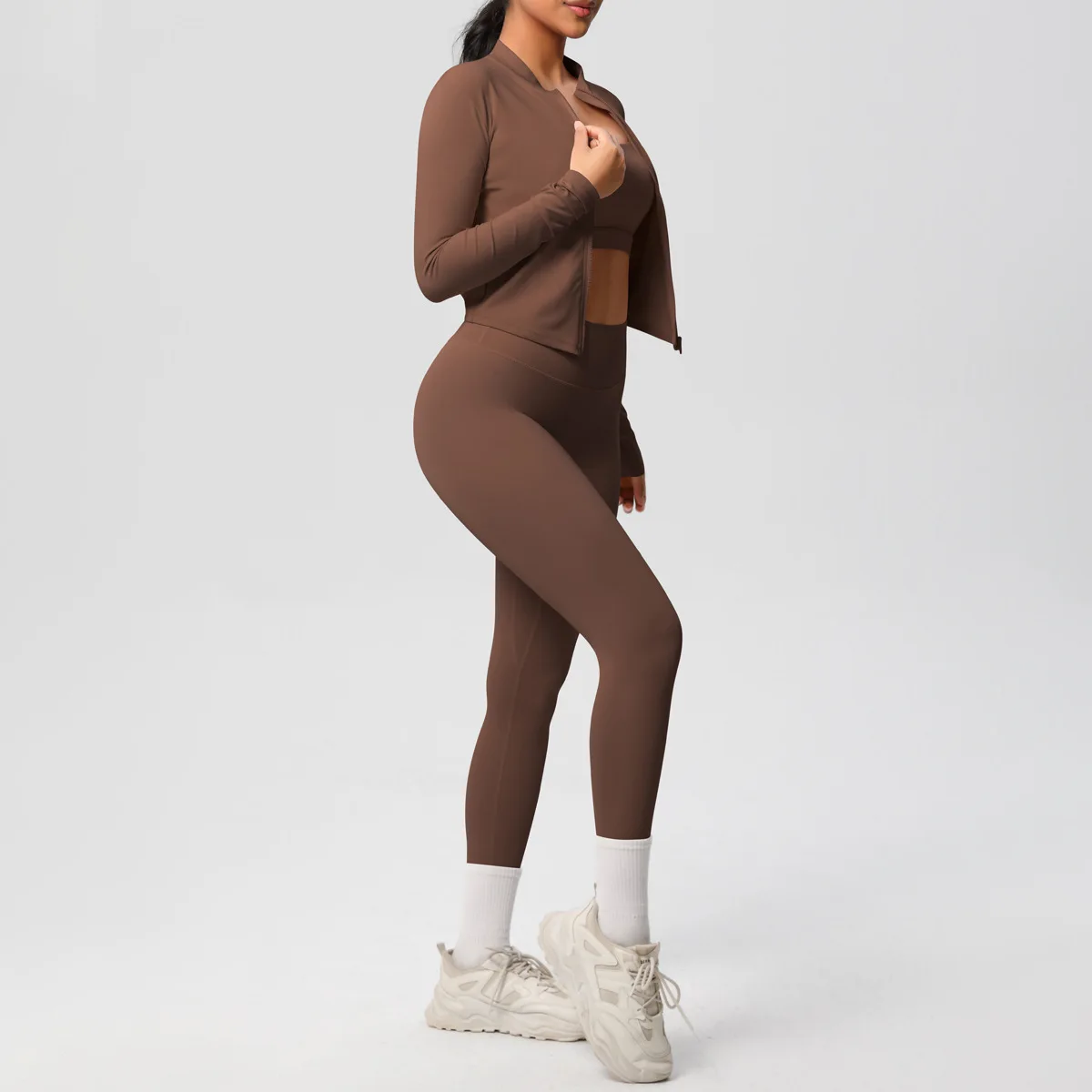 Women's Active Wear Gym Yoga Run Workout Sportswear Fitness 3PCS Clothing Sets Long Sleeve Tops Zipper Jacket High Solid Front