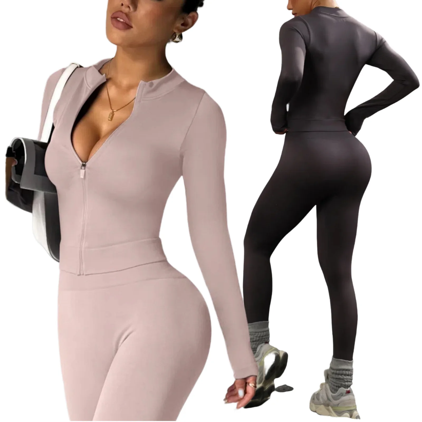 High Waist Yoga Suit Long Sleeves Elastic Waist Full Zipper Closure Solid Pattern Sports Outfit Hip Lift Bound Feet Logo Front