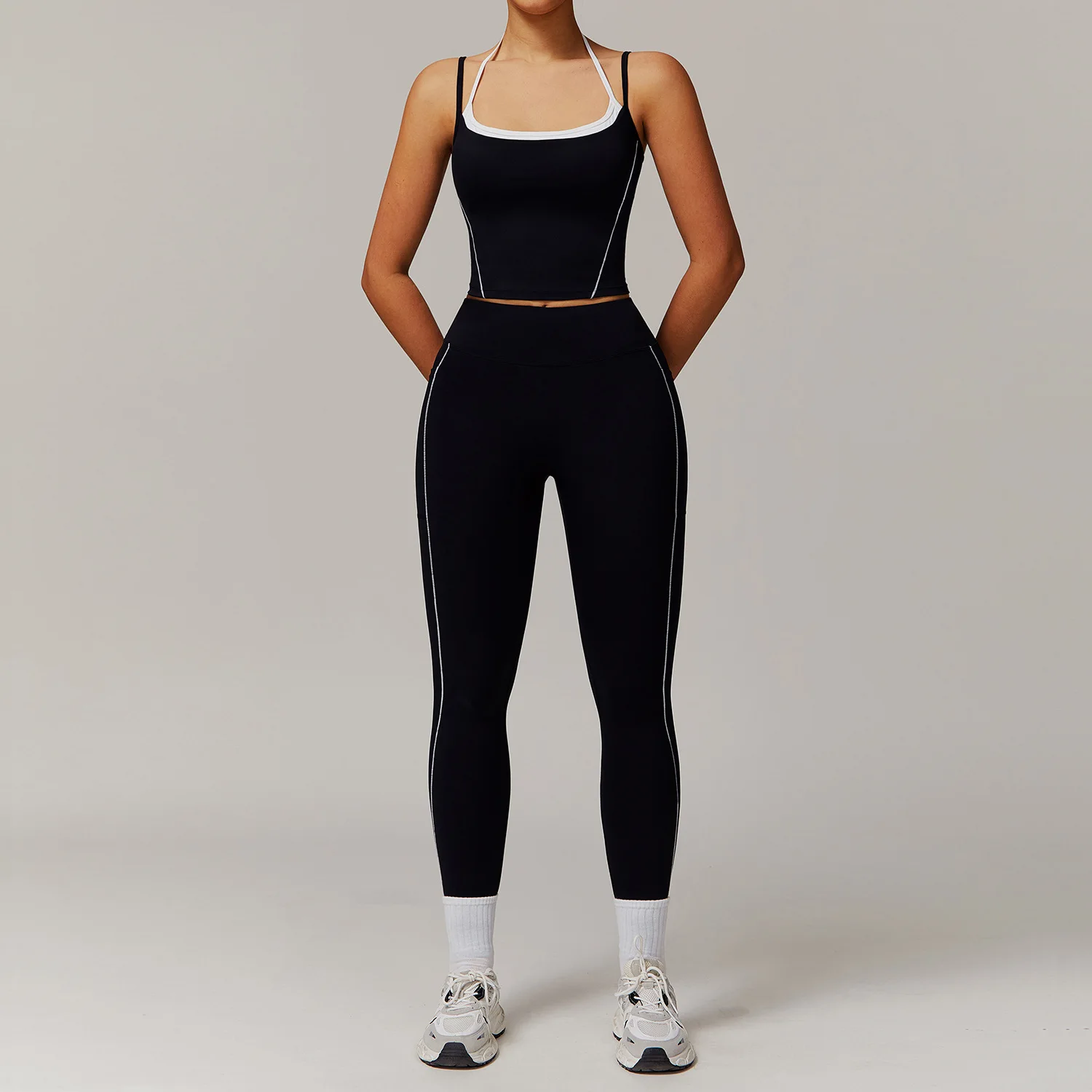 Tummy Control Cross Gym Leggings Back Fake -Piece V-neck Solid Breathable Folded High Waist Casual Versatile Fitness Yoga Set