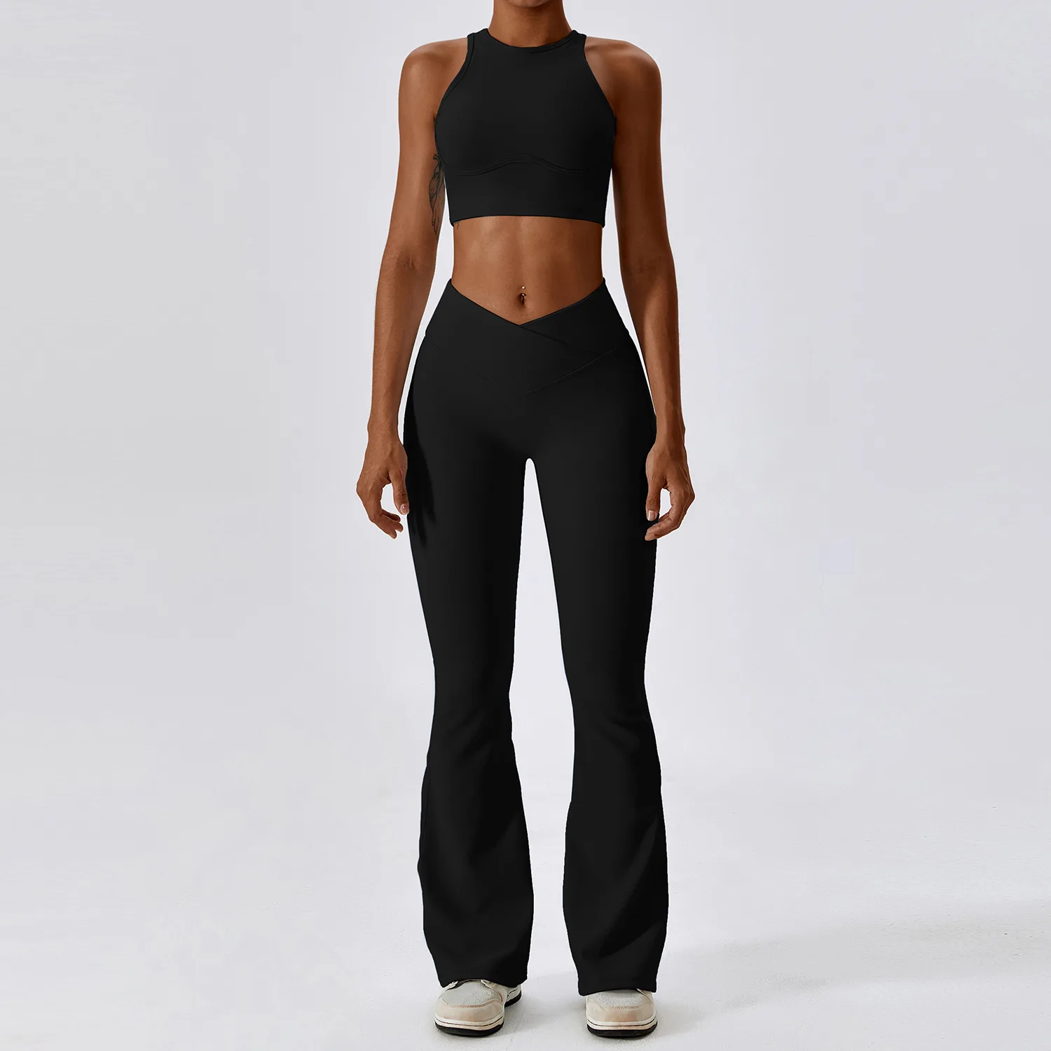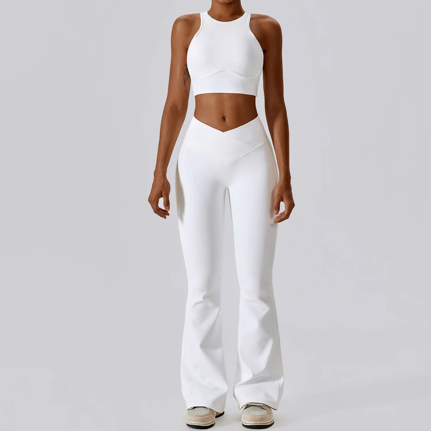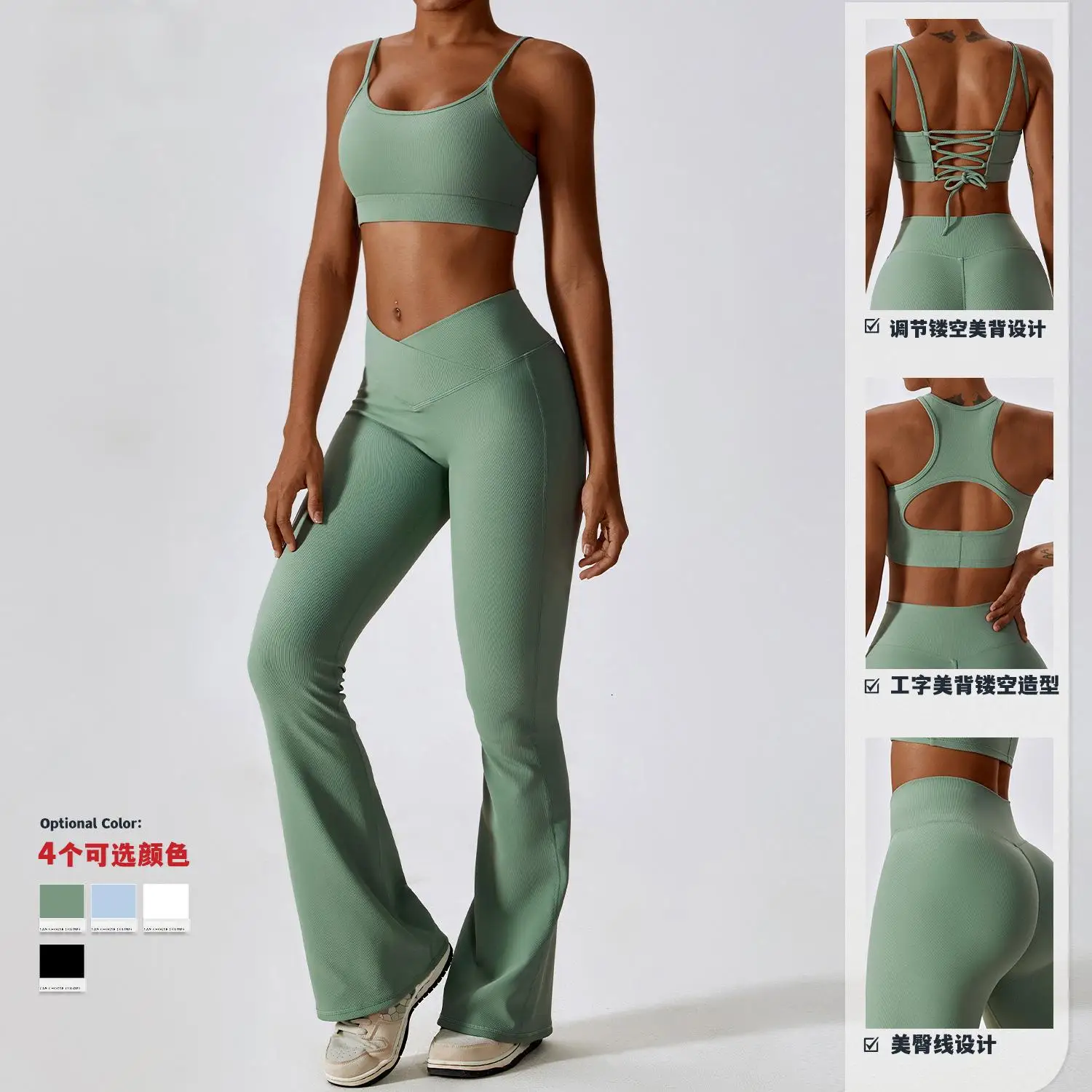 Ribbed Solid Tummy Control Push High Waist Butt Lift Flared Pants Quick Dry Slim Fit Outfit Tight Training Activewear Yoga Set