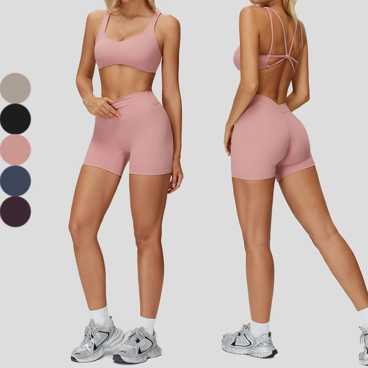 2026 New Arrival Cross Back Sports Bra Butter Lifting Short Two Piece Set Workout Fitness Yoga Set