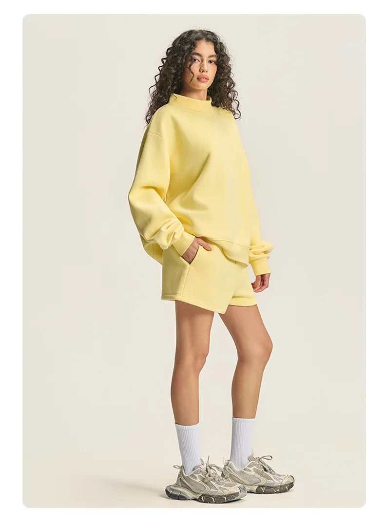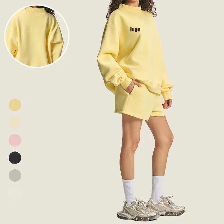 Wholesale Half High Round Neck Womens Fleece Tracksuit Women Short Sets Pullover Sweatsuit