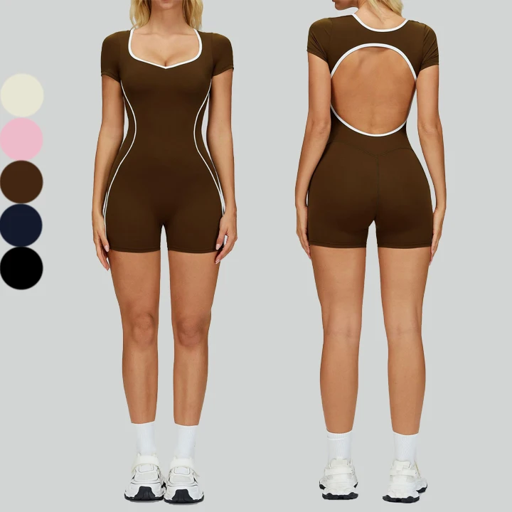 Custom Logo Womens V-collar Design Color Blocking Stripes Backless Hollow Out One Piece Active Wear Jumpsuit Gym Yoga Jumpsuit