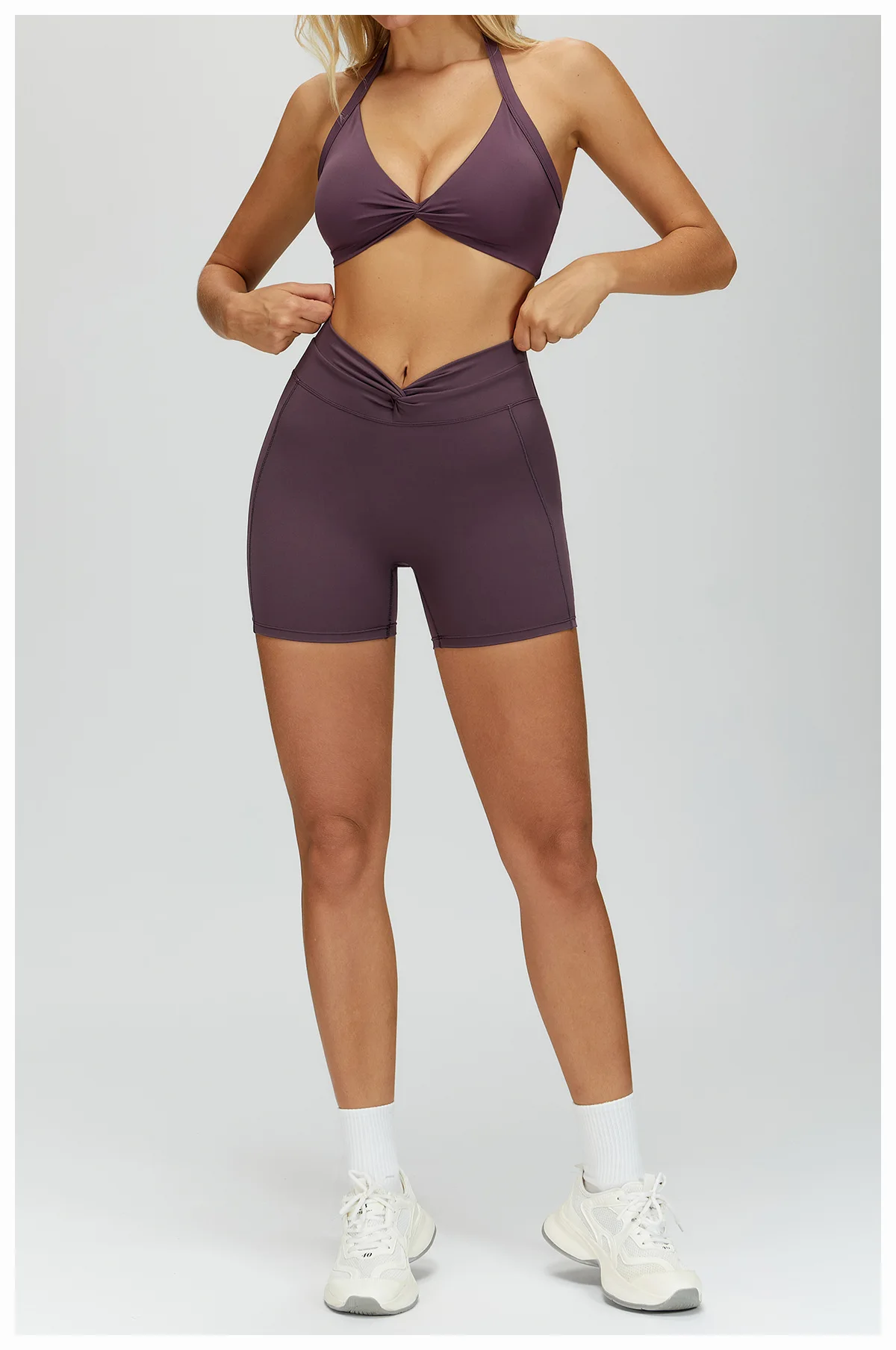 Naked Feel Solid Color Deep-v Front Twist Design Halter Sports Bra Cross V-waist Bottom 2 Piece Gym Set Yoga Sets