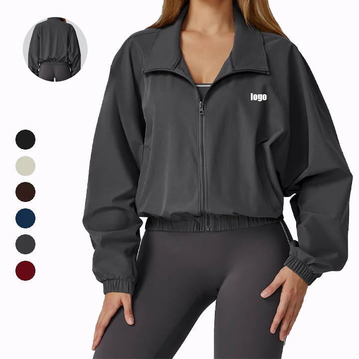 Wholesales Zip up Stand Collar Crop Jackets Women Gym Exercise Loose Solid Sports Jacket