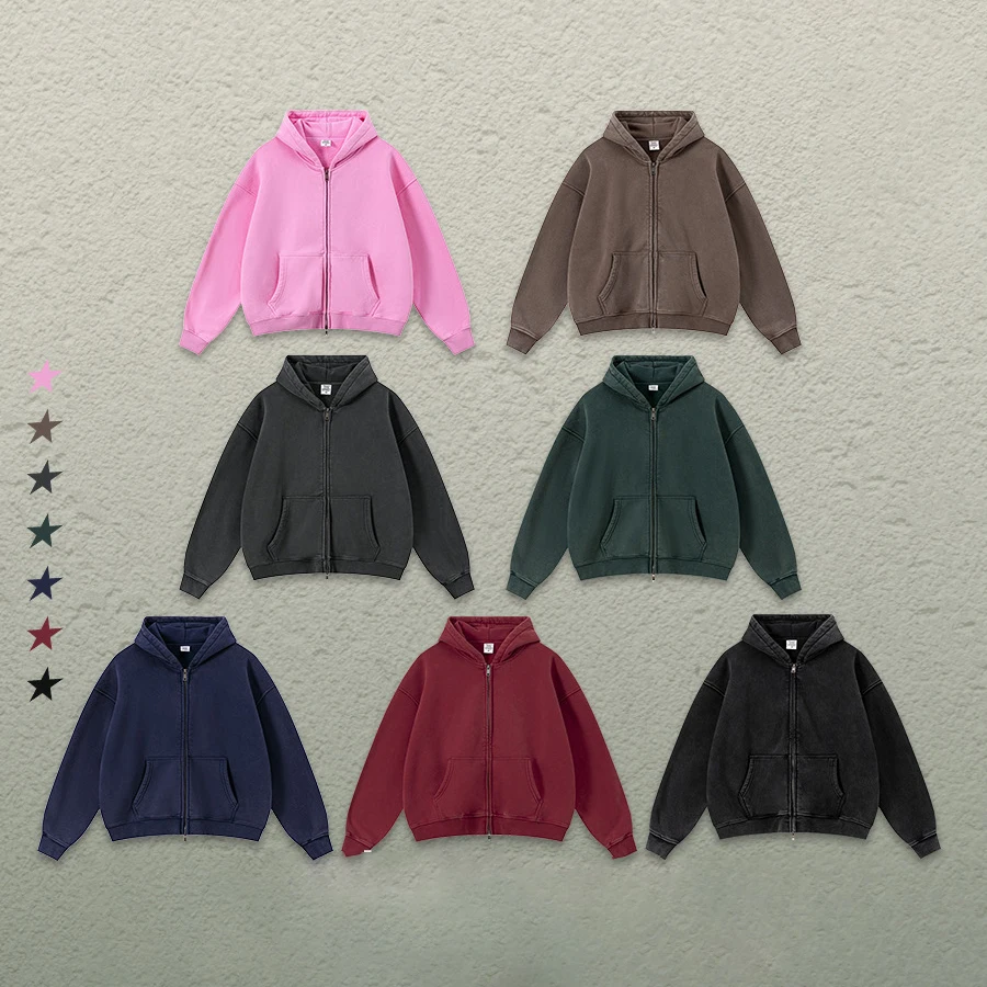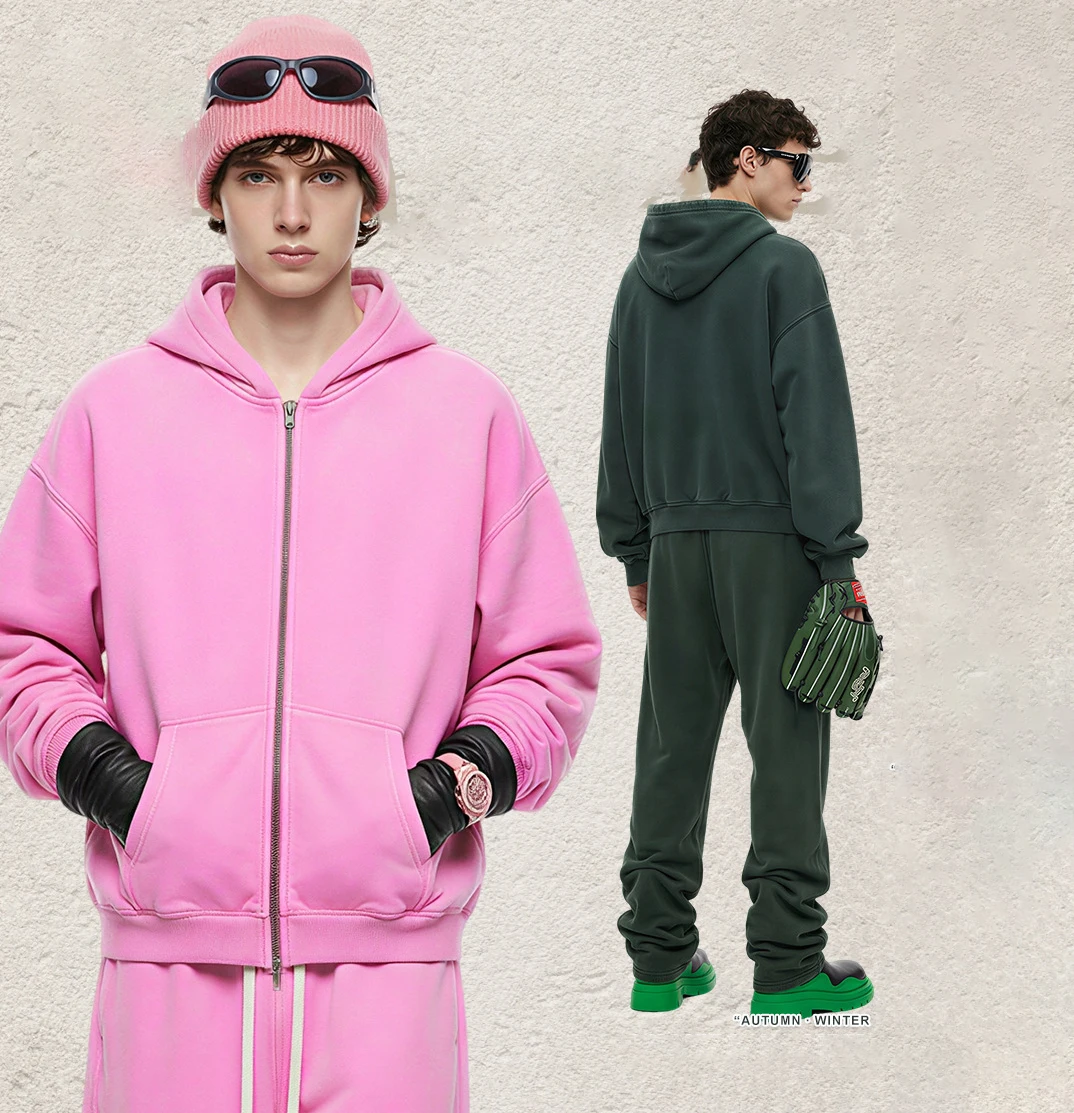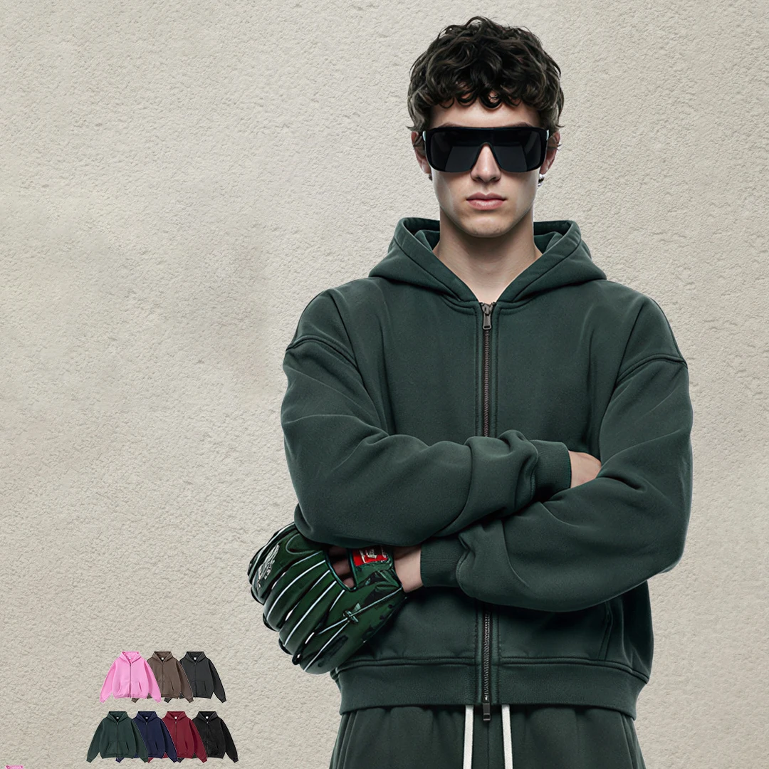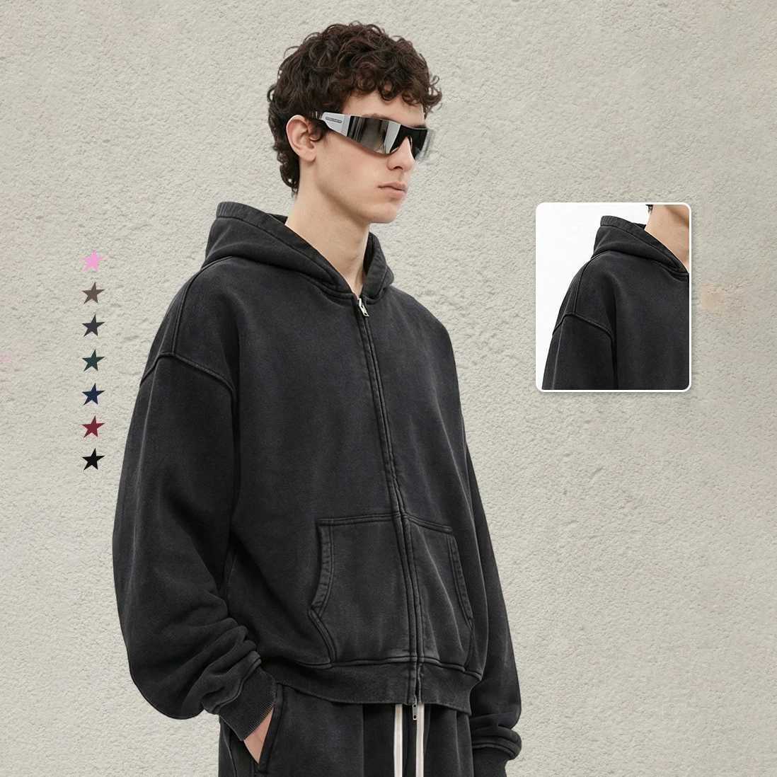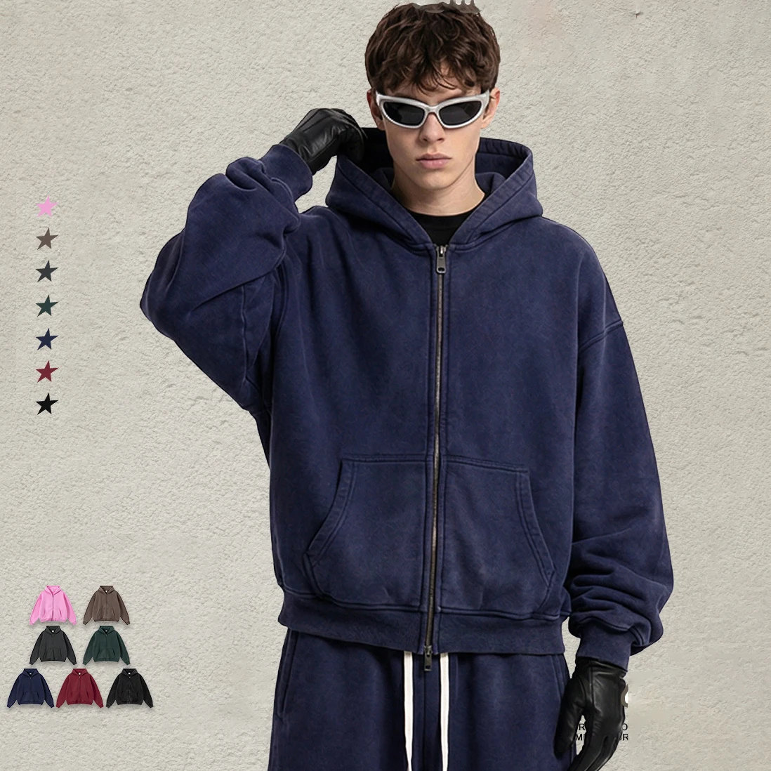 Customized Logo 400 GSM Double Headed Zipper Sweatshirt Hoodie Heavyweight Washed Fleece Hoodie