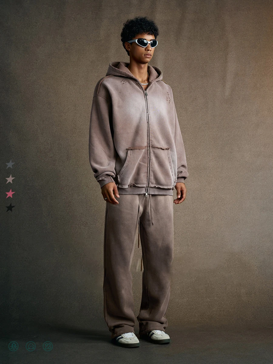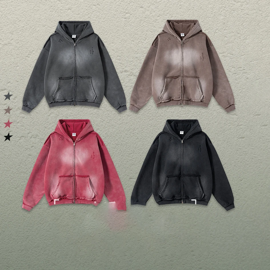 2026 Autumn Mens 400 GSM Vintage Distressed Raw-Edge Spray Stone-Washed Hoodie Oversized Zipper Hoodie
