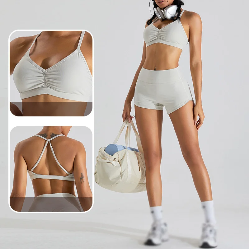 Higher Quality Hot Selling Comfortable Fit Crossed Back Pleated V Neckline Yoga Set Sports Wear Gym Fitness Sets