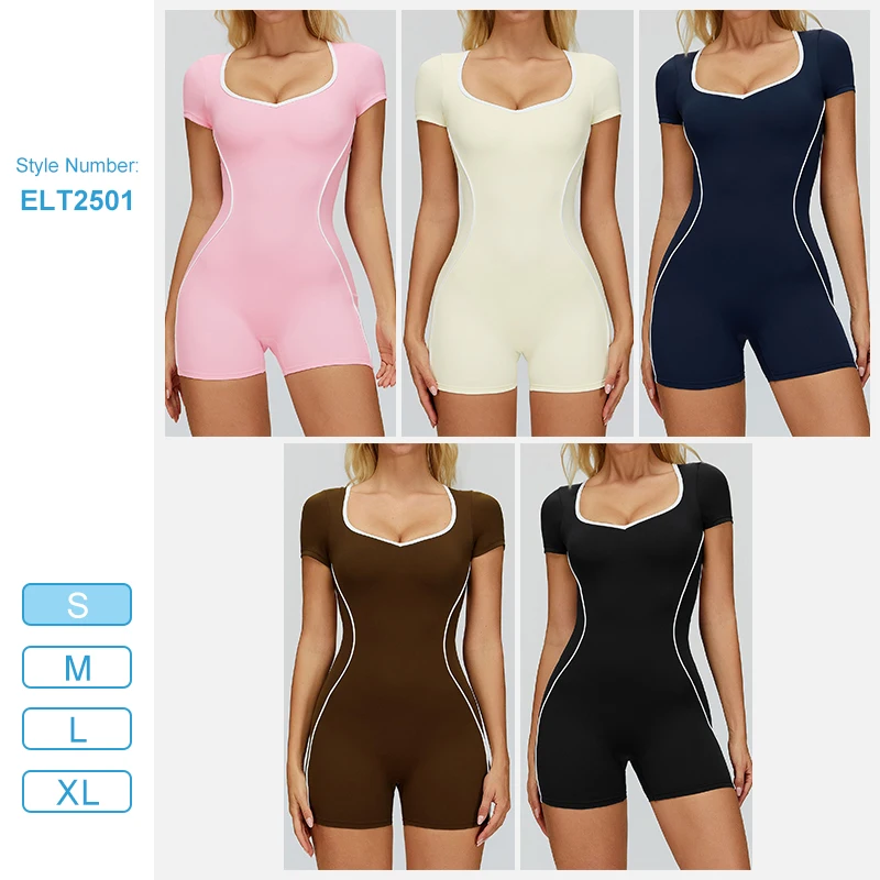 ELT2501 Women Scoop Neck Short Sleeve Jumpsuit Hollow Back-fitted Fitness Workout Suit Color Blocking One Piece Jumpsuit