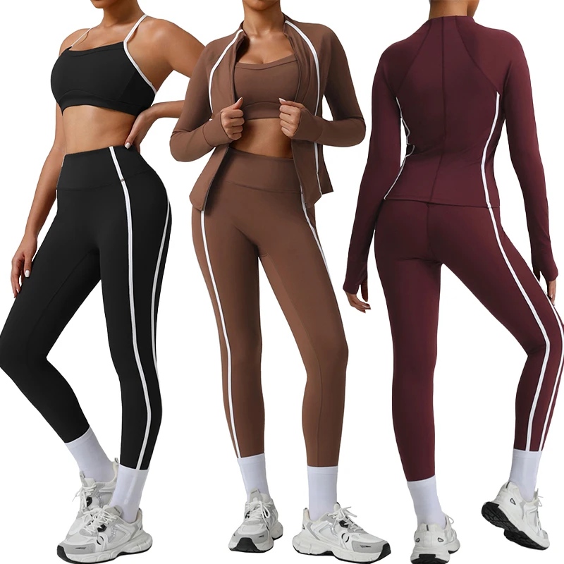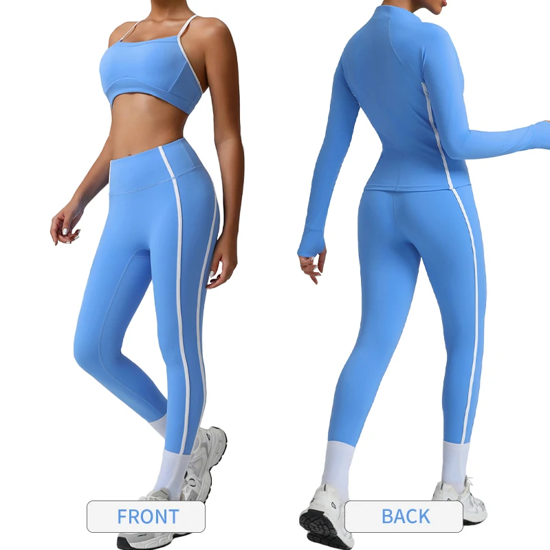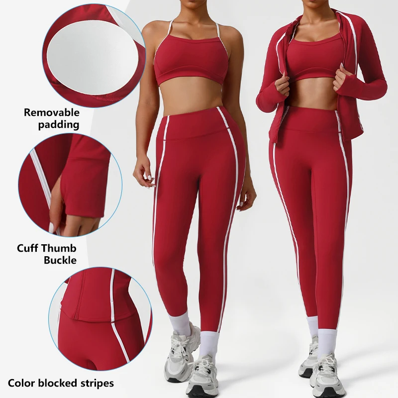Sm2543 Blocking Colors Stripe Yoga Set Cross Back Sports Bra with Padding High Waist Leggings Yoga Coat Fitness Gym Outdoors
