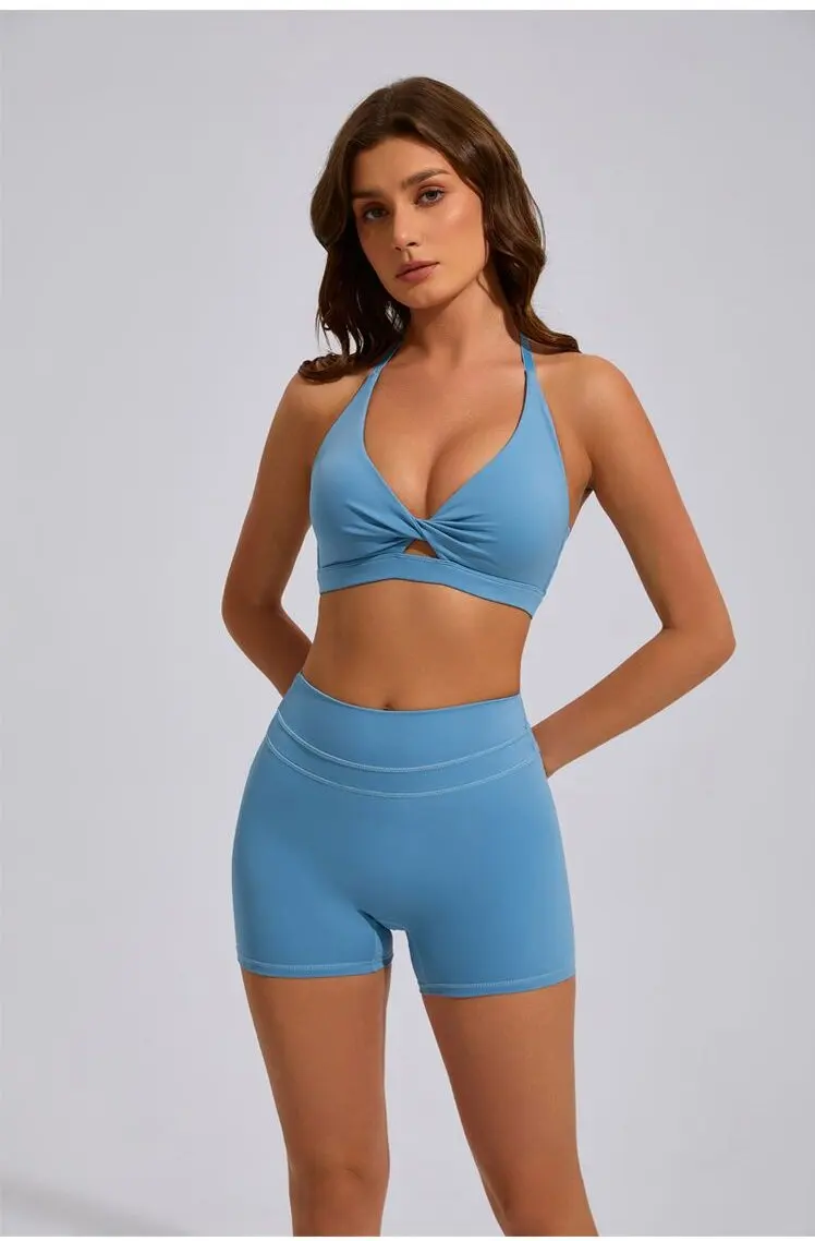 Custom Logo Front Activewear Women Plus Size Yoga Halter Bra Shorts Leggings 2-Piece Gym Fitness Set