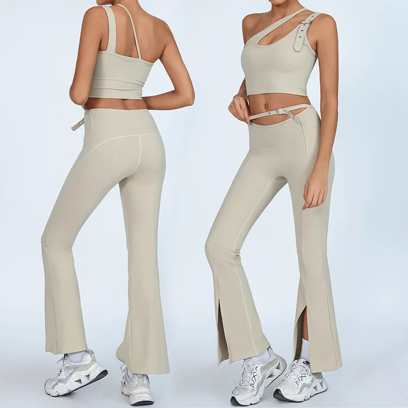 Roregal One Shoulder Beautiful Back Yoga Bra Set Women's Tight Sports Fitness Yoga Split Flared Pants
