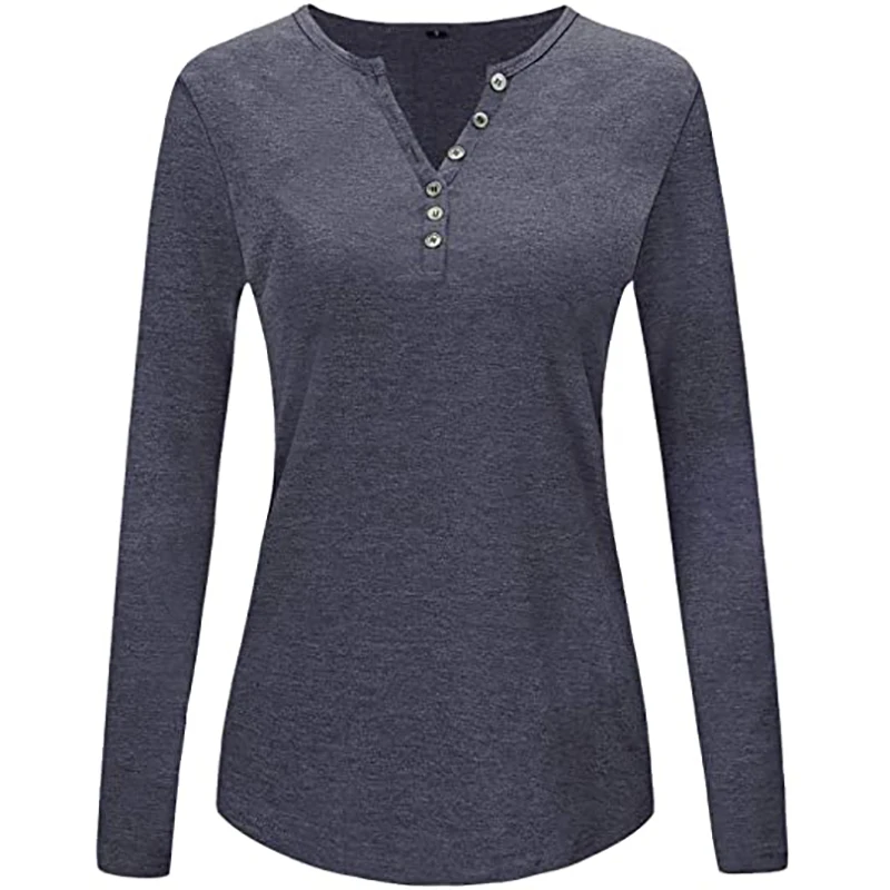 Ladies Long Sleeve V-neck Button Down Fitted Pullover Women Tops Blouses and t Shirts