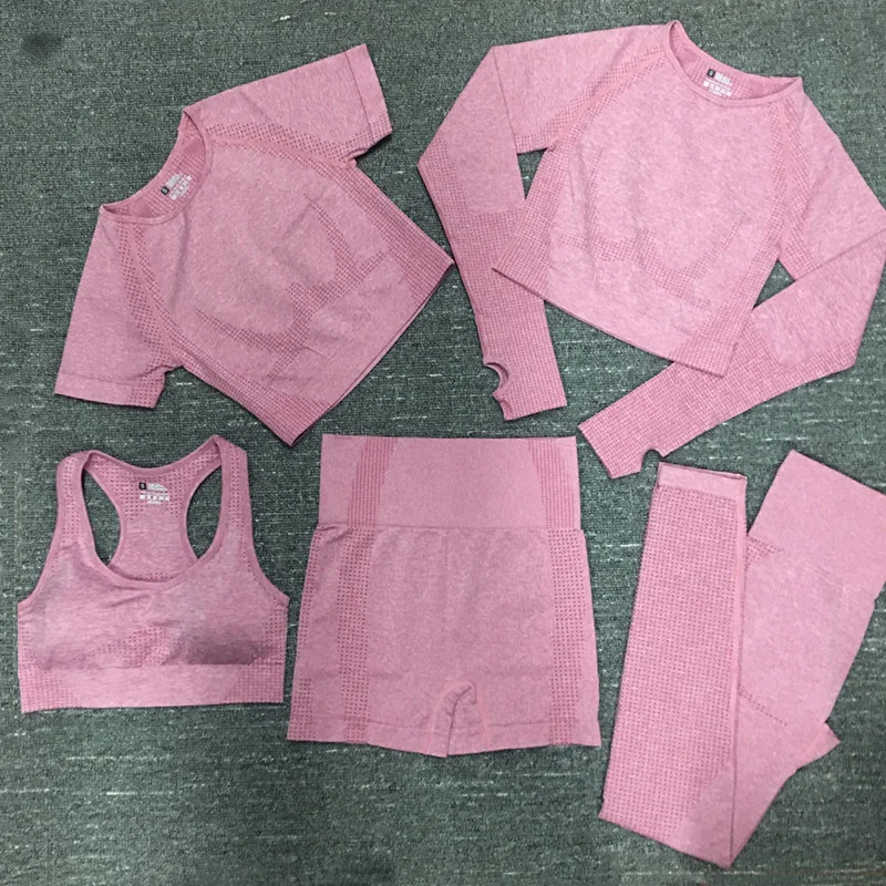 YISHENHON Women's Fitness Activewear Set 5pcs Seamless Yoga Leggings & Bras with Long Sleeve Gym Tops Solid Pattern Sport Outfit