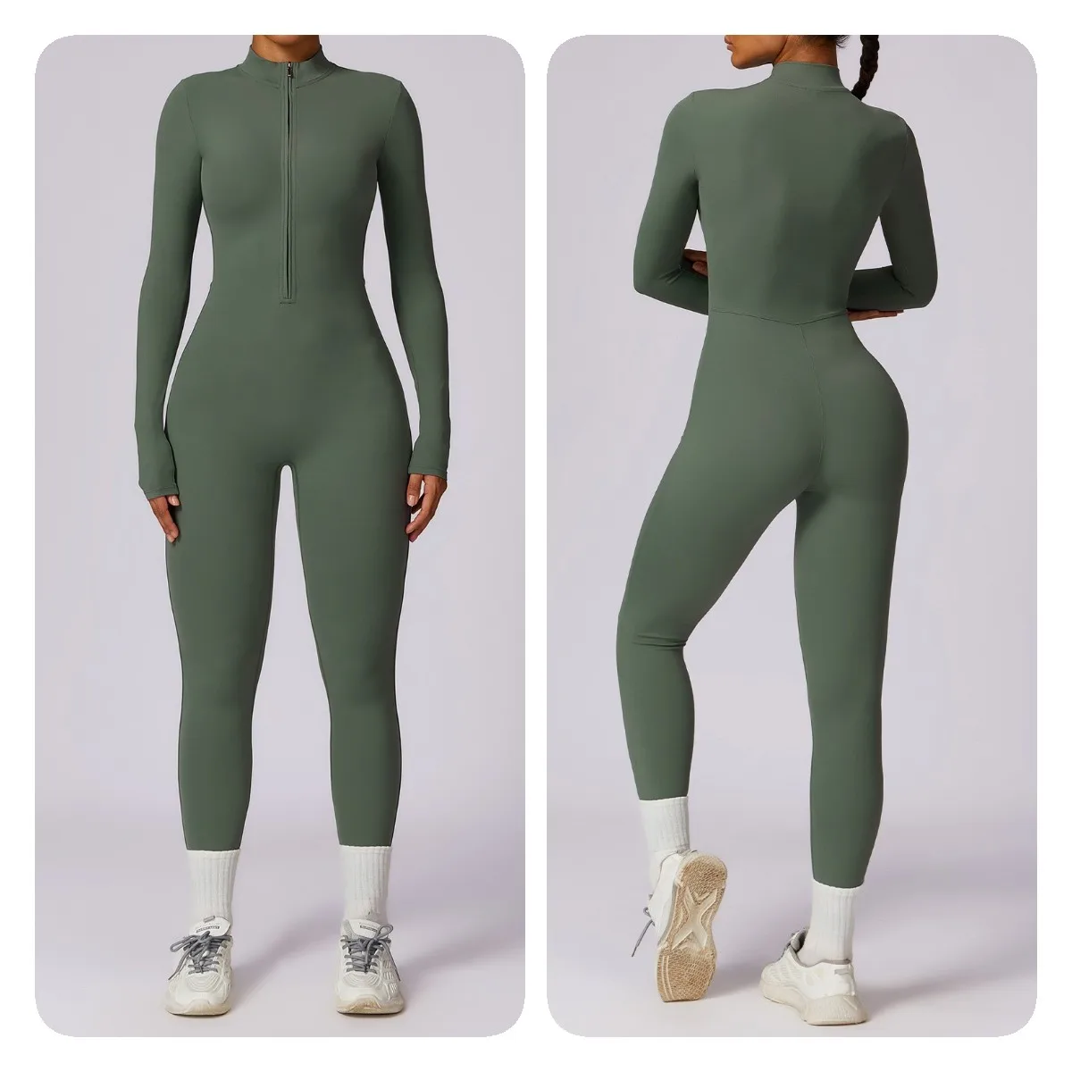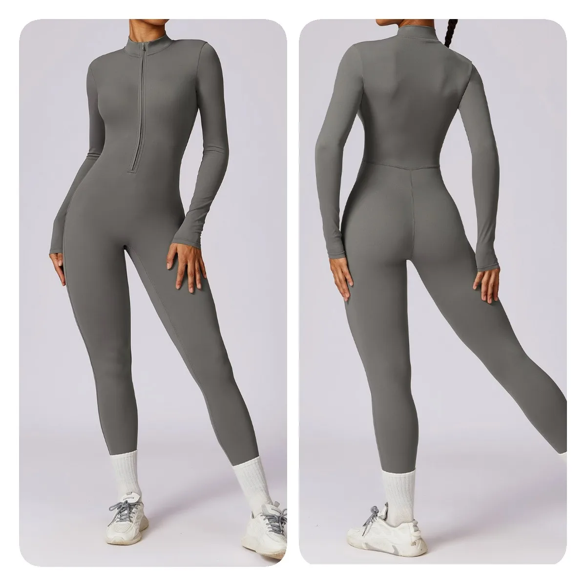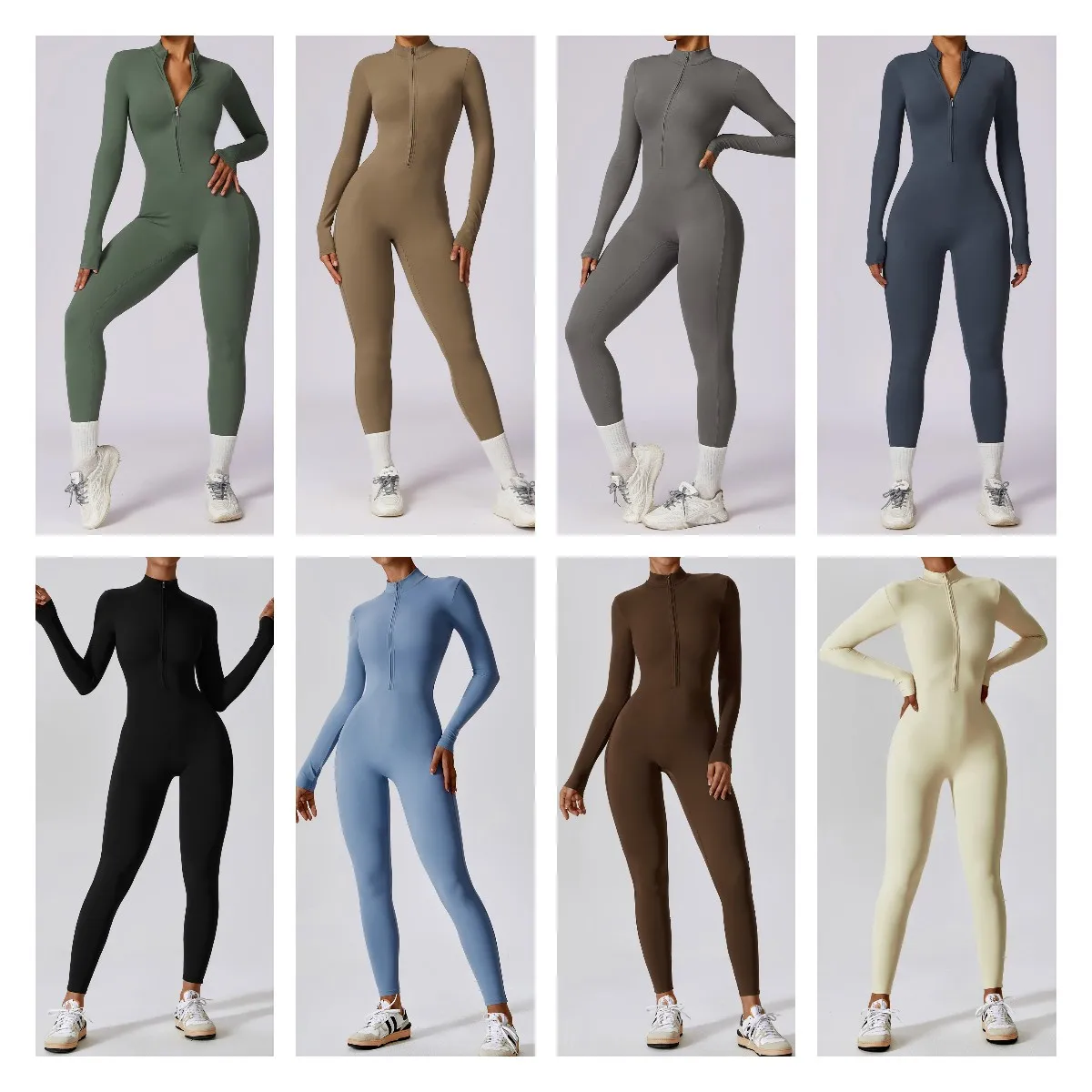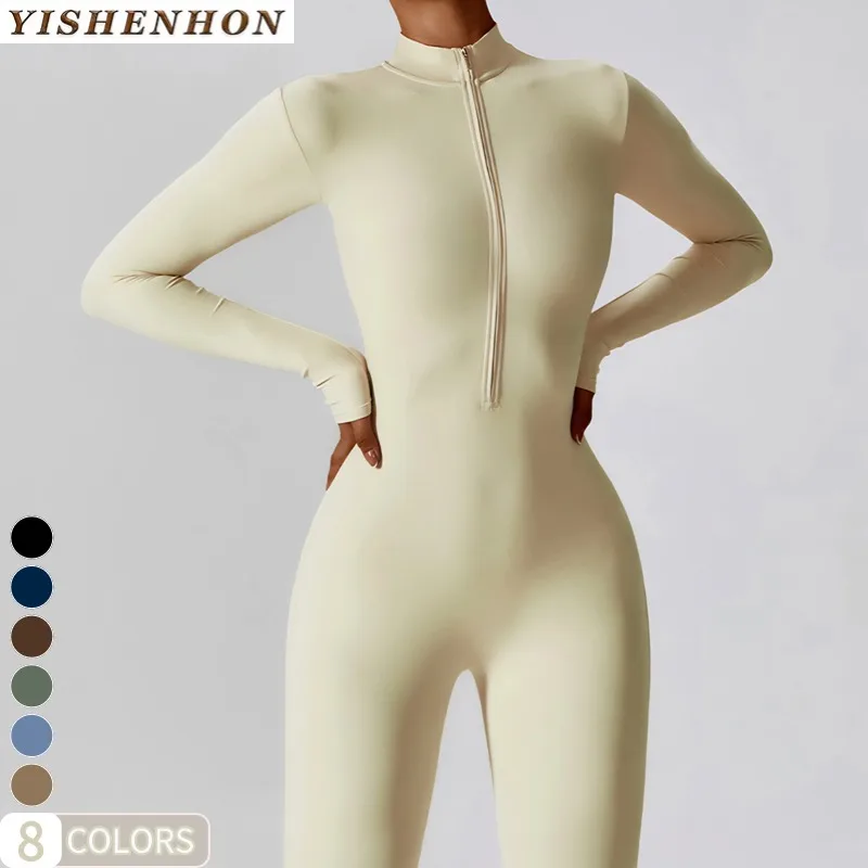YISHENHON Custom Logo Women's Fashion Outfit Solid Nude V-Neck Casual Bodycon Yoga Jumpsuit with Long Sleeves for Summer