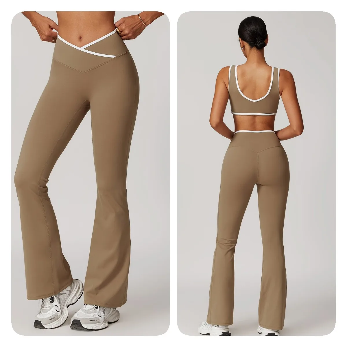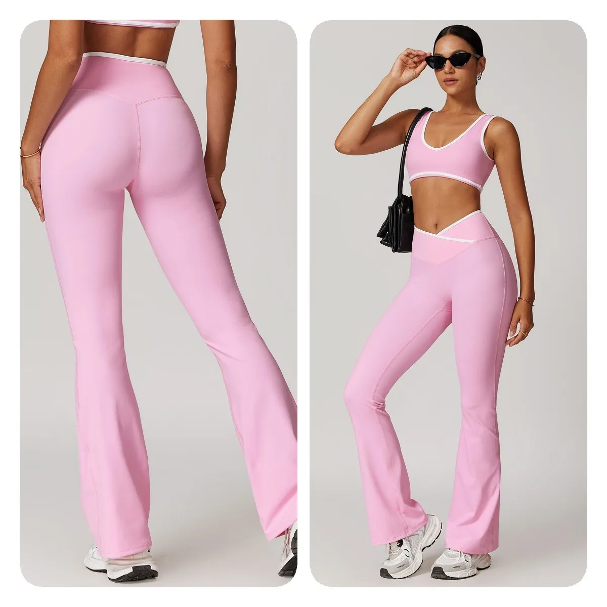 YISHENHON Yoga 4 Pcs Sets Contrast Color Stitching Fitness High Waist Flare Pants Sports Set Outdoor Gym Wear for Women 2 Sets