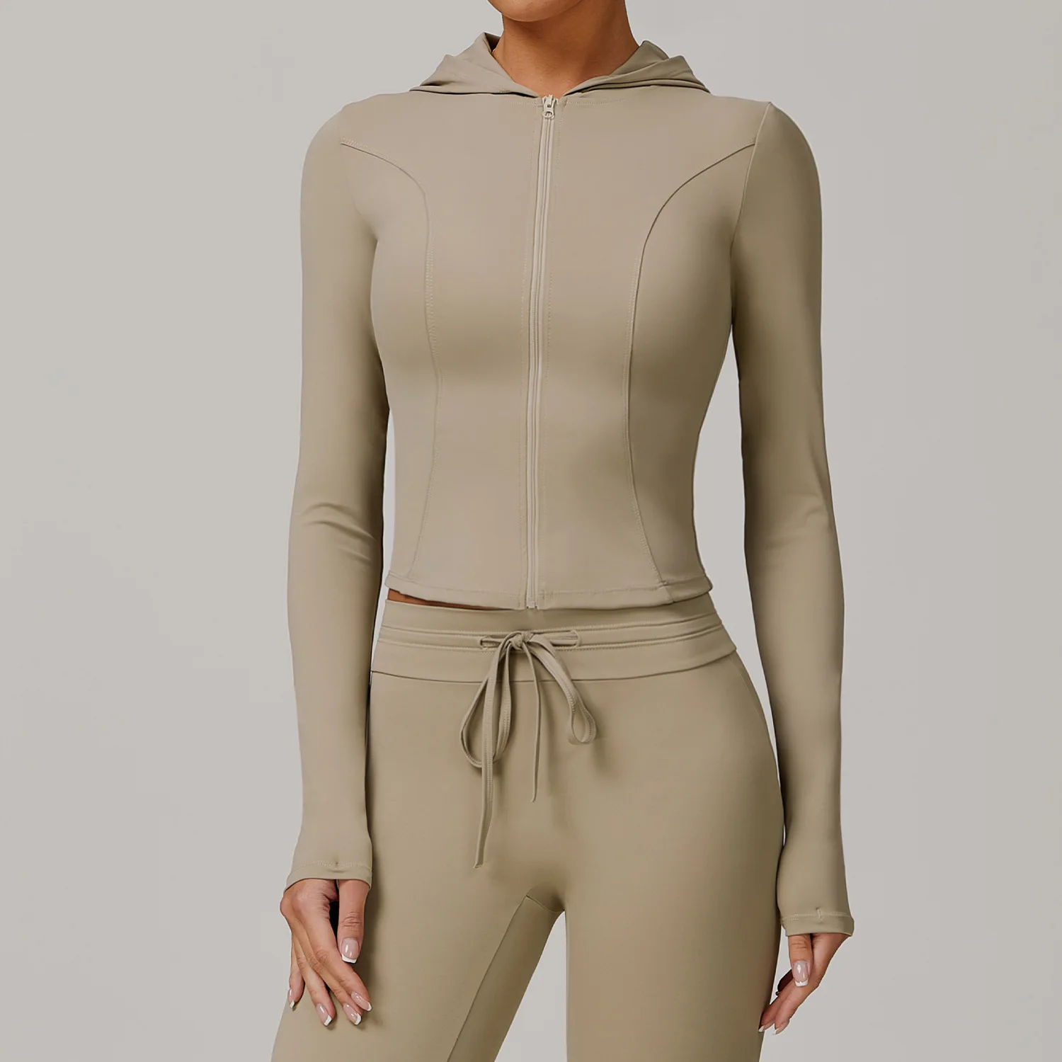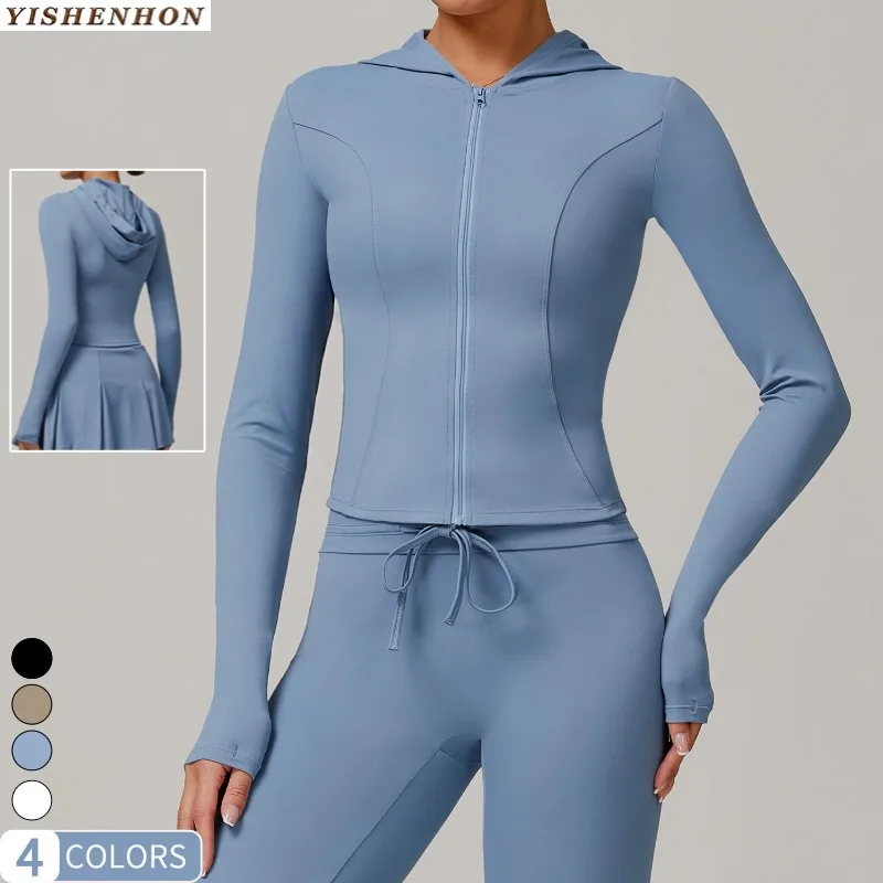 YISHENHON Custom Logo Slim Workout Top Yoga Jackets Zipper Womens Tight Quick Dry Long Sleeve Yoga Sports Coat With a Hat