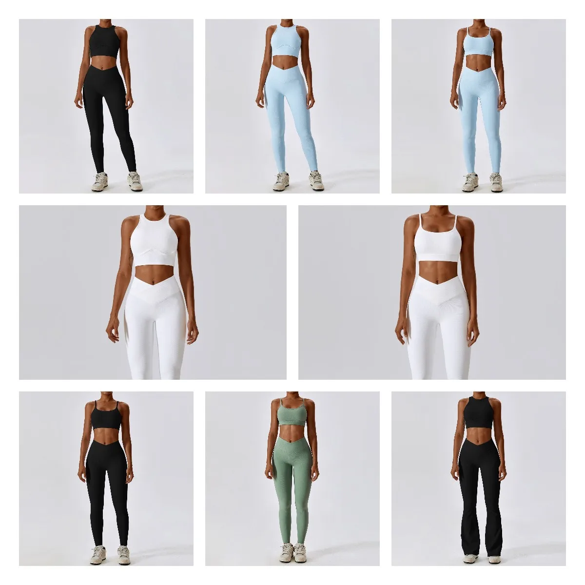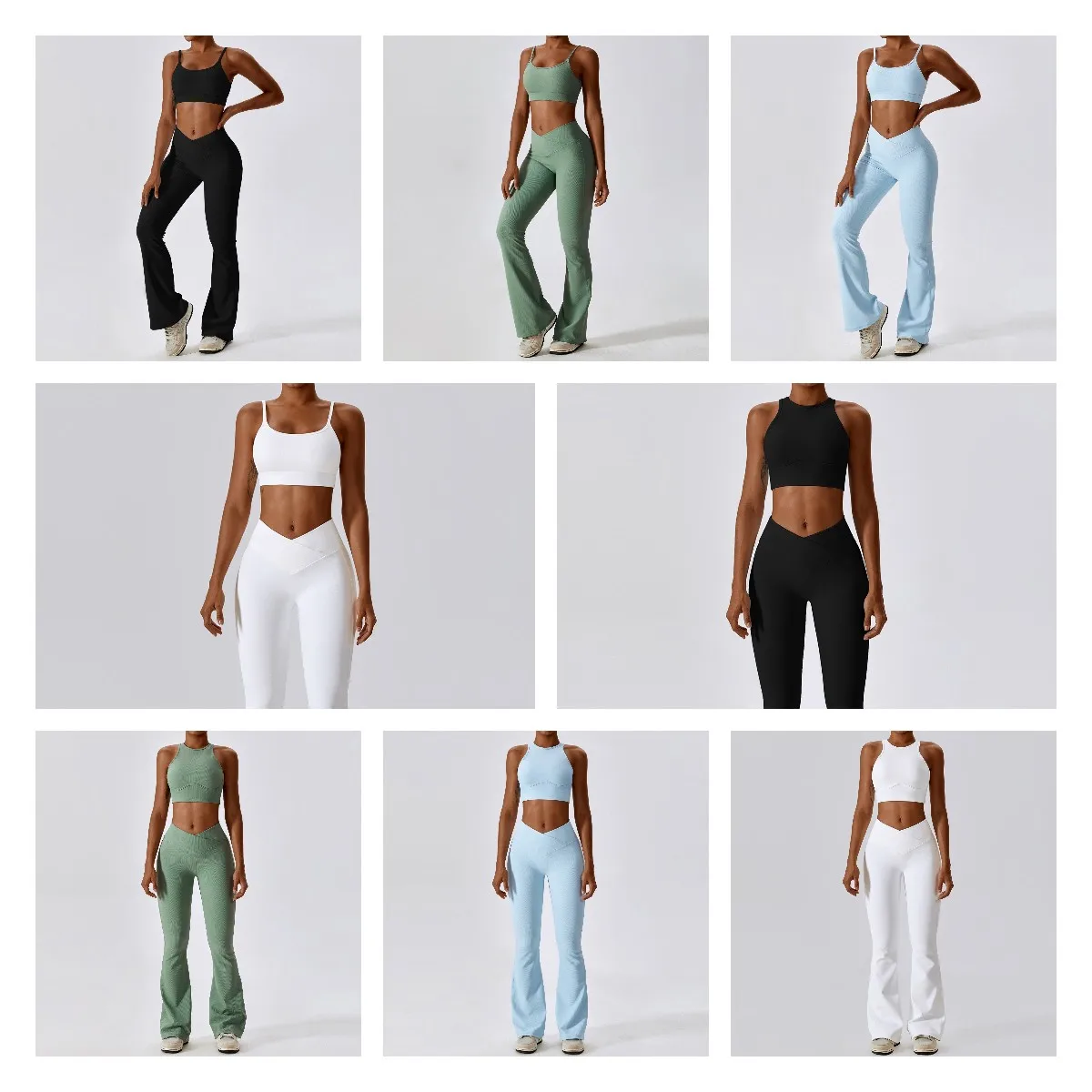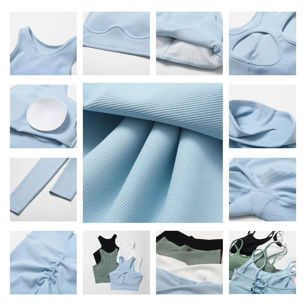YISHENHON Gym Fitness Set Women Hanging Neck Sports Halter Bra Yoga Pants V Cross Waistband 4 Pcs Yogawear Women Workout Sets
