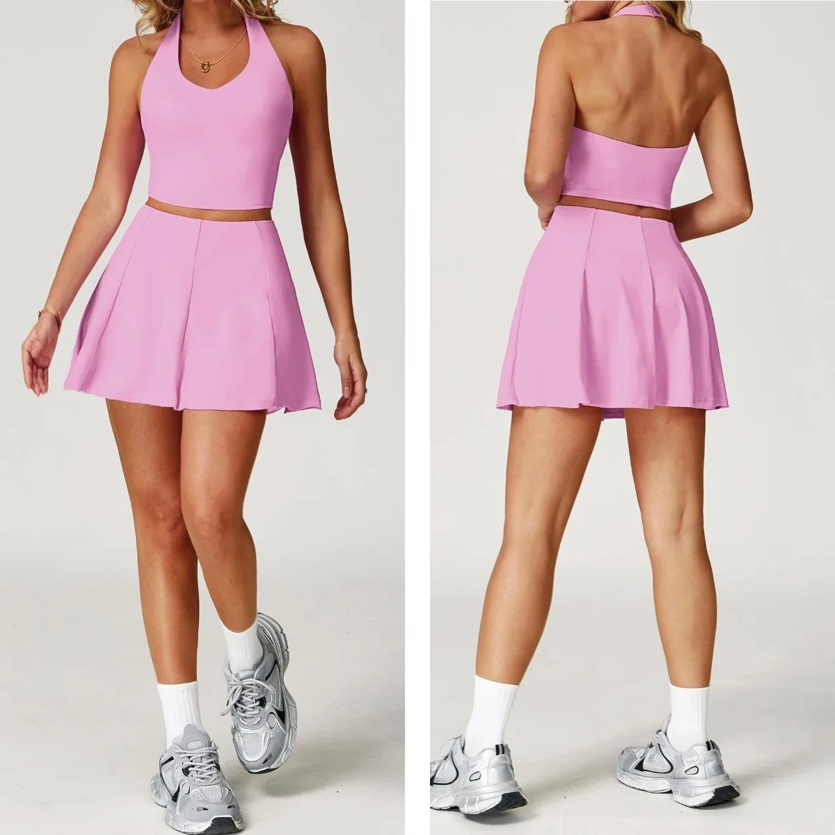 YISHENHON V-Neck Quick-drying Sports Tennis Suit Anti-emptied A-line Skirt Anti-glare Exercise Running Fitness Tennis Sets