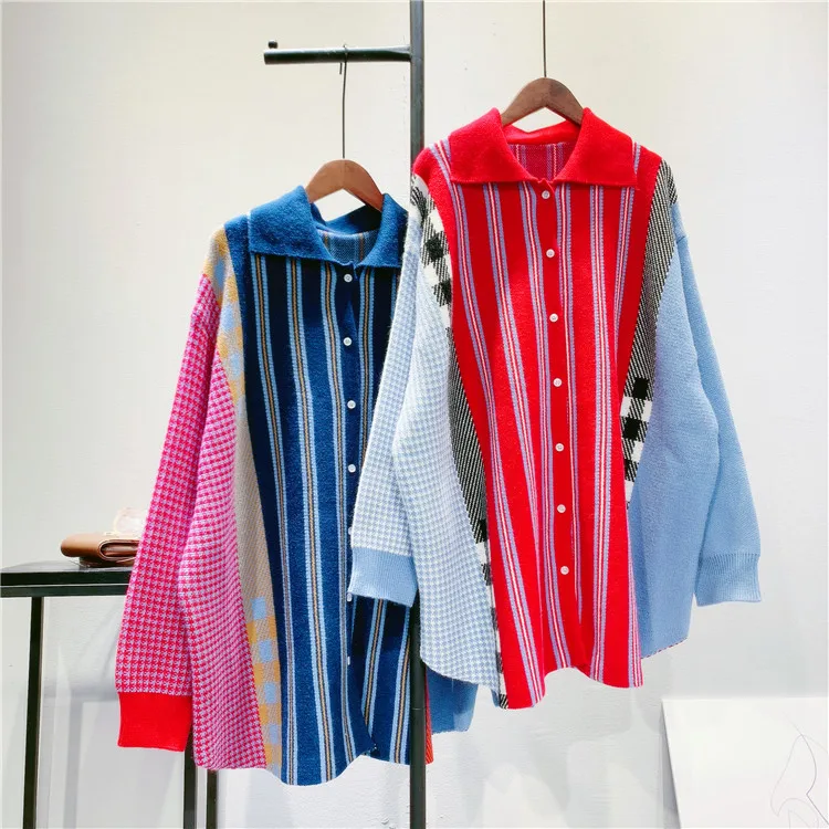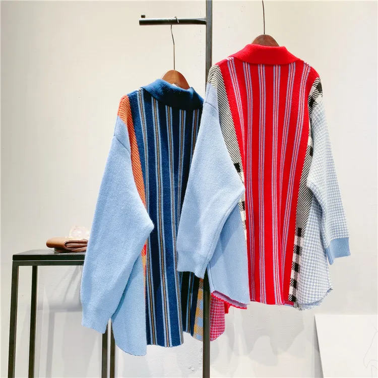 Luxury Ladies Sweater Knitted Wear Patchwork Color Turn-Down Collar Long Loose Style for Autumn Season Casual Girls' Wear