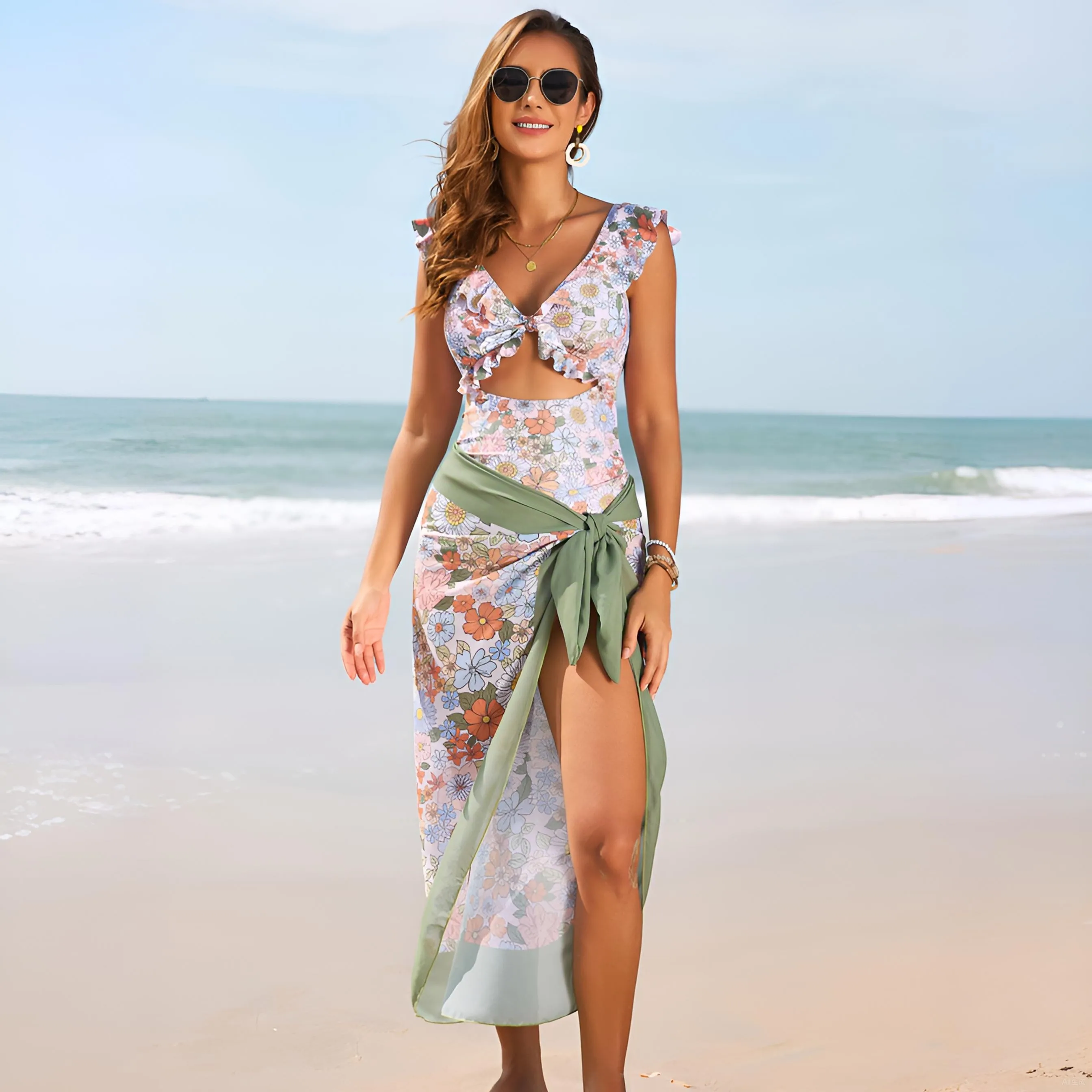 2026 Plus Size Ruffle Cut Out Solid 2-Piece Bikini Set with Sarong-Breathable Beachwear