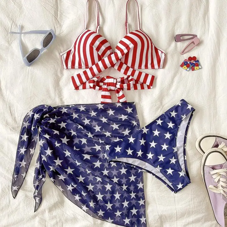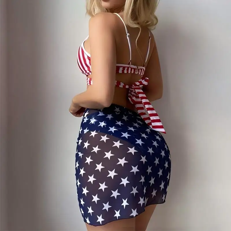 2026 America Summer Big Hard Cup 3 Piece Set Flag Printing Polyester/Spandex Breathable Backless Women's Swimsuit
