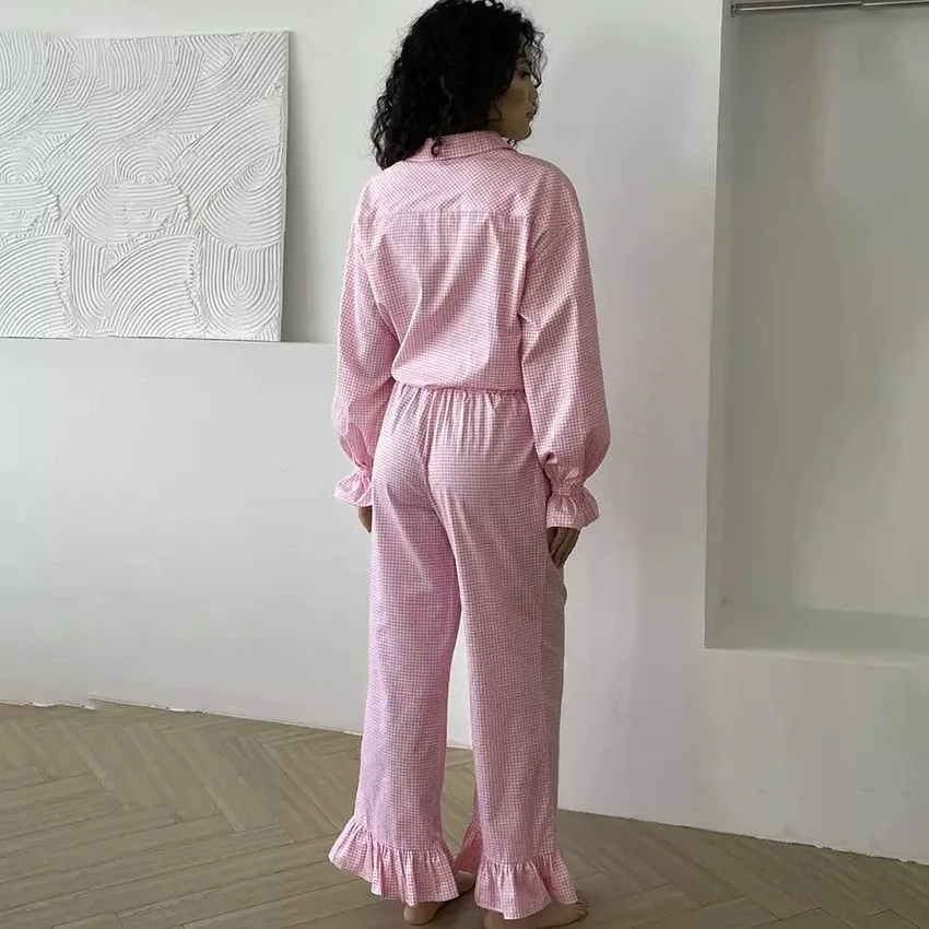 Wholesale Custom Logo Pyjama Home Clothes Ruffle Sleepwear Lapel Full Sleeves 2 Piece Set Pajamas Plaid Loungewear Women Sets