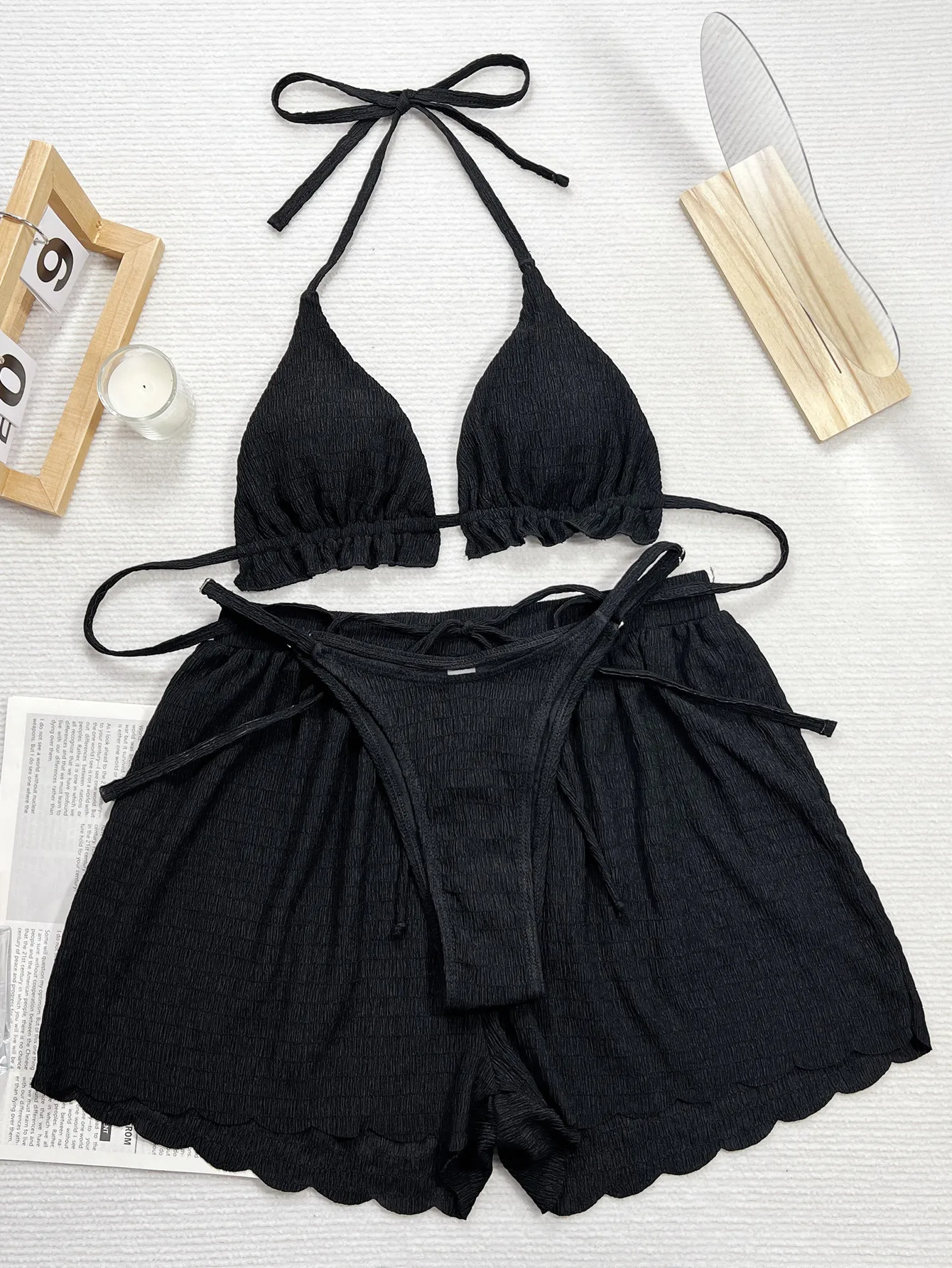 Wholesale Custom Logo Swimwear Women's 3 Piece Bikini Sets Frill Trim Halter Swimsuit Backless Textured Bathing Suit with Shorts
