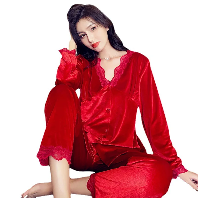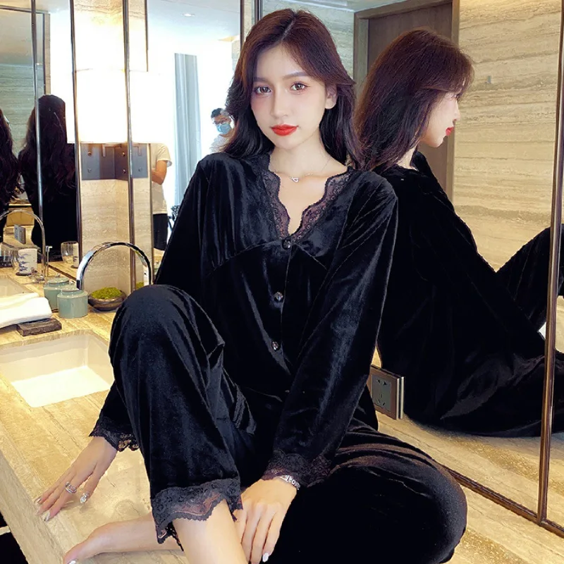 High Quality Ladies Winter Velvet Lace Sleepwear Casual Leopard Homewear V Neck Nightwear 2026 Long Sleeve Luxury Pyjamas Femme